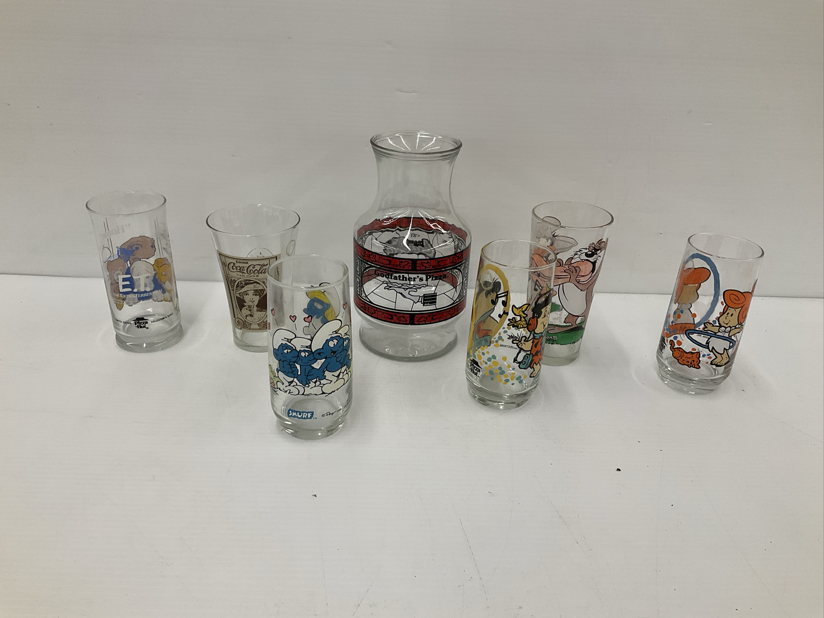 This lot includes an assortment of graphic glasses. The glasses feature E.T., The Flintstones, Coca-Cola, Looney Tunes, The Smurfs, Godfather's Pizza/Coca-Cola. A great collection for a fan of pop culture and classic brands. Tallest 11 in.