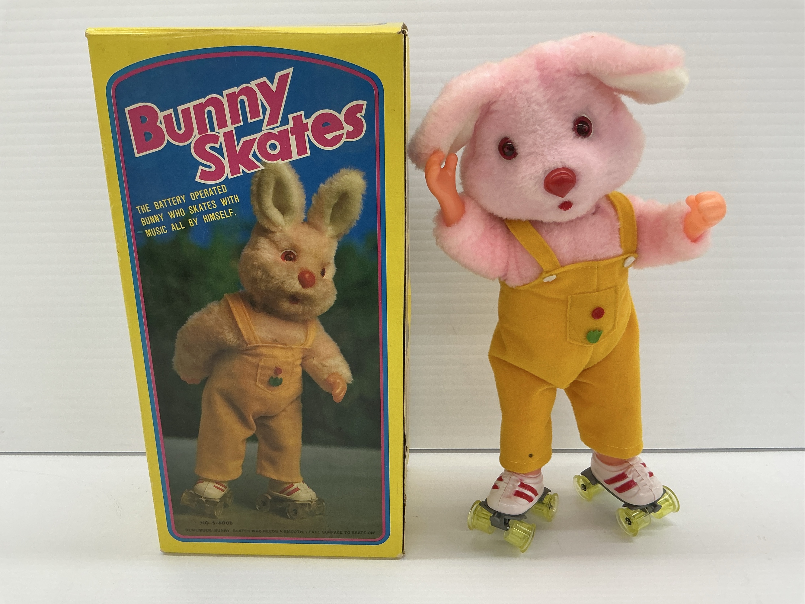 This listing features a Bunny Skates battery-operated toy with its original box. The toy is a plush bunny wearing yellow overalls and skates. The box shows images of the toy and details about its functions, including its ability to skate and play music. The toy requires batteries (not included). 14.25 in. tall