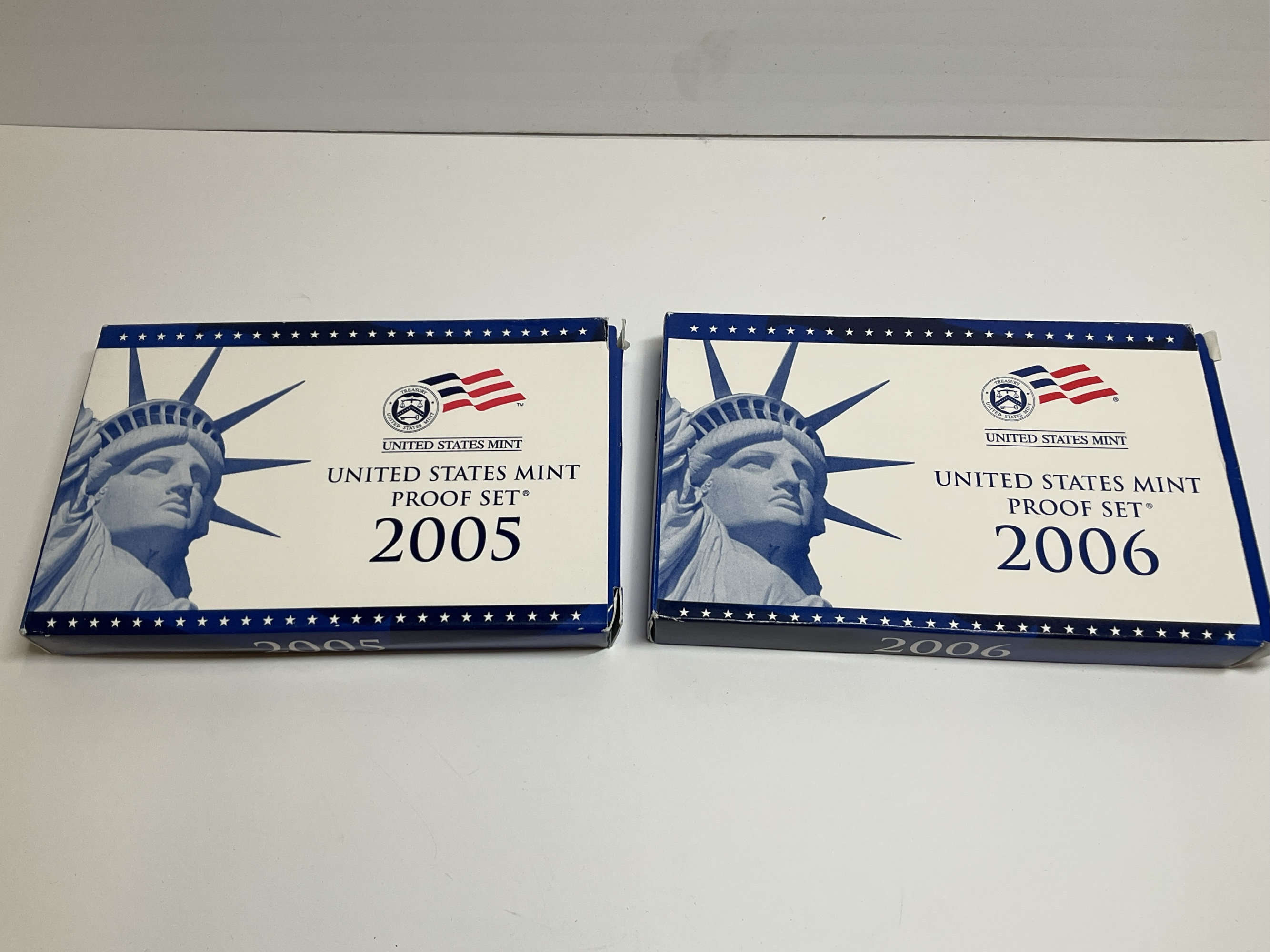 Two US Mint proof sets from 2005 and 2006. Each set includes the original box and certificate of authenticity, and features proof coins including state quarters.