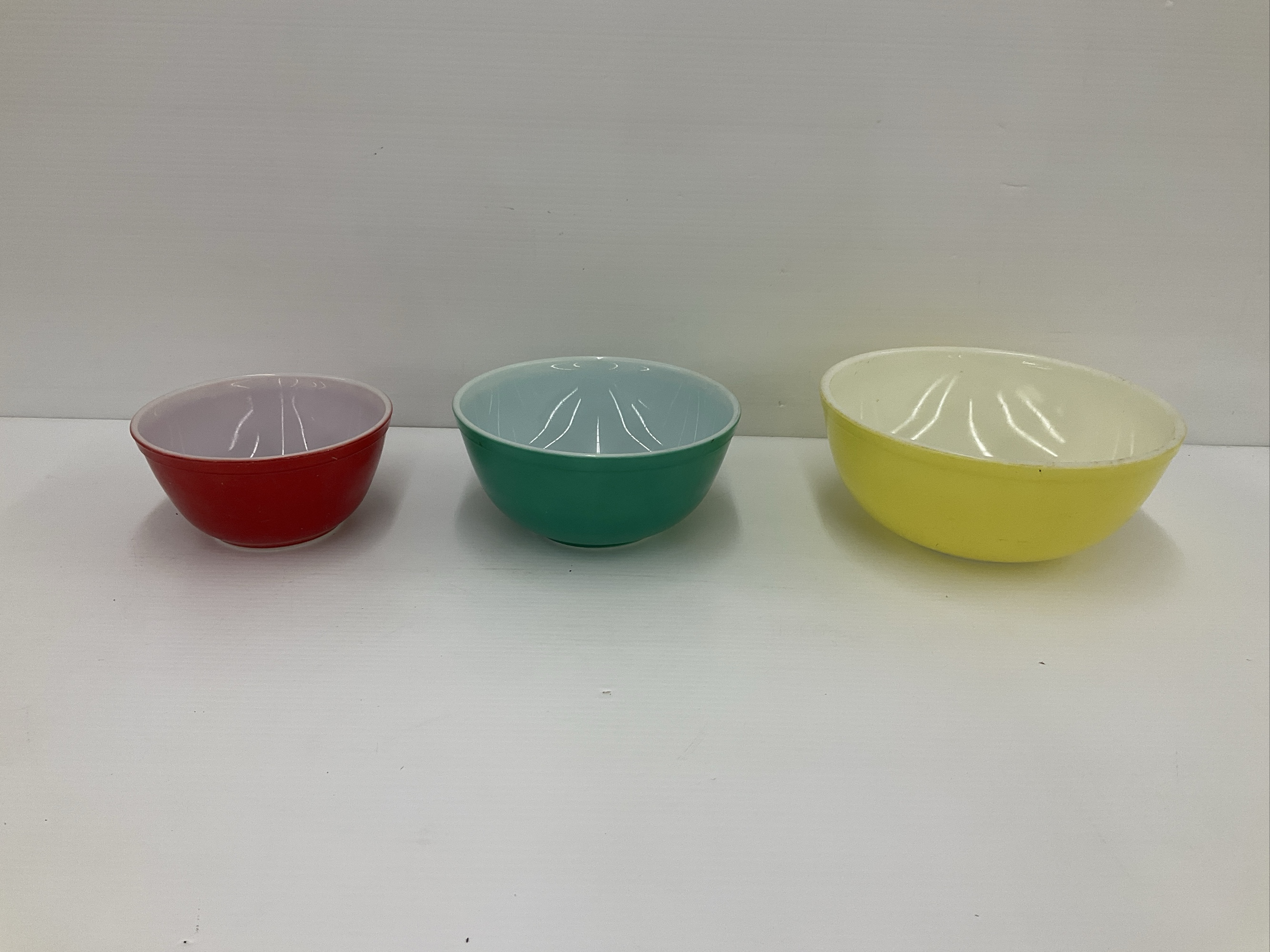 Offered for auction is a set of three Pyrex nesting bowls in the primary colors. This set includes red, green, and yellow bowls. Each bowl is marked 'Pyrex'. Largest 404 yellow 4 Qt.