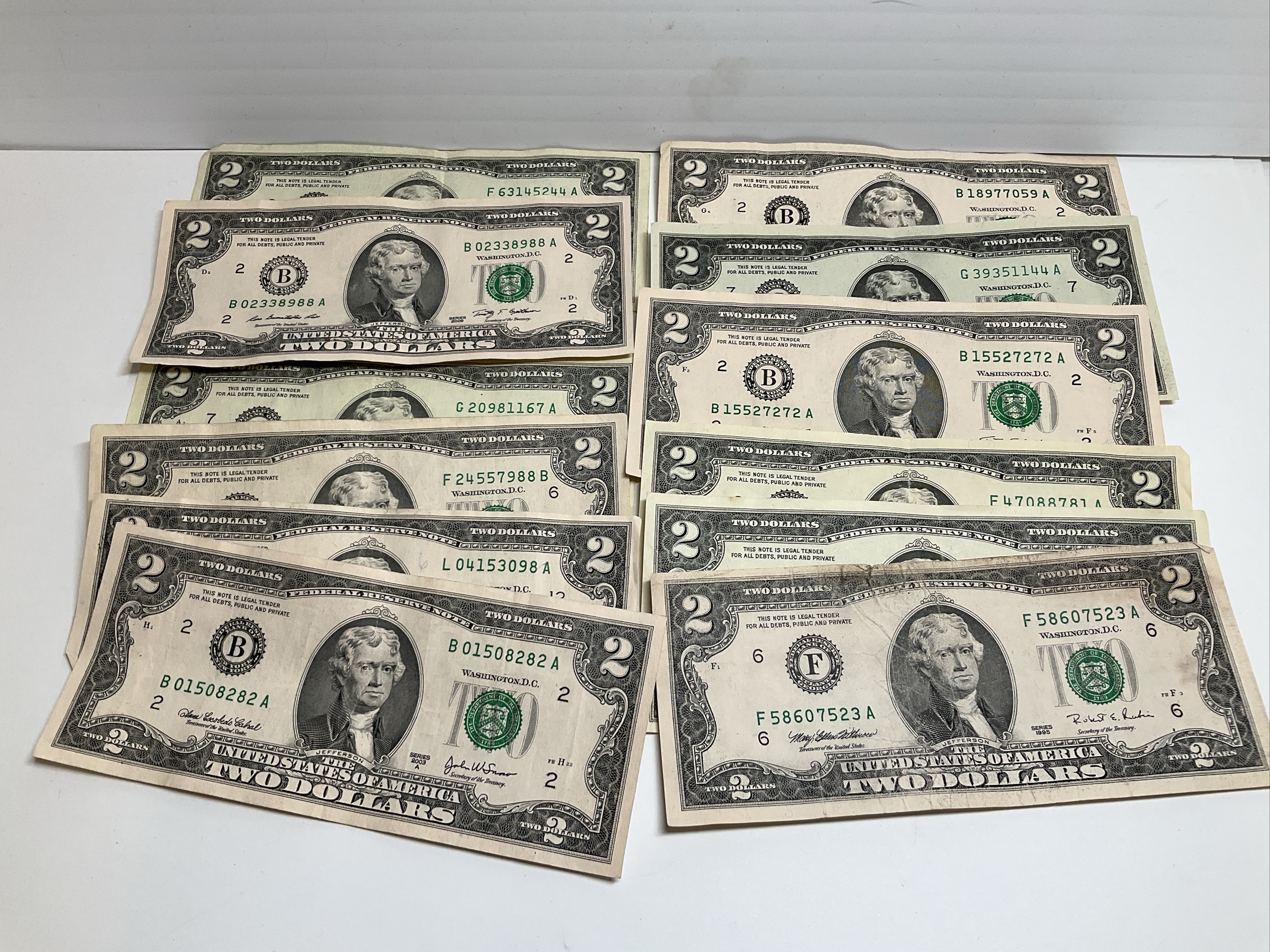 Lot of Twelve United States Two Dollar Bills