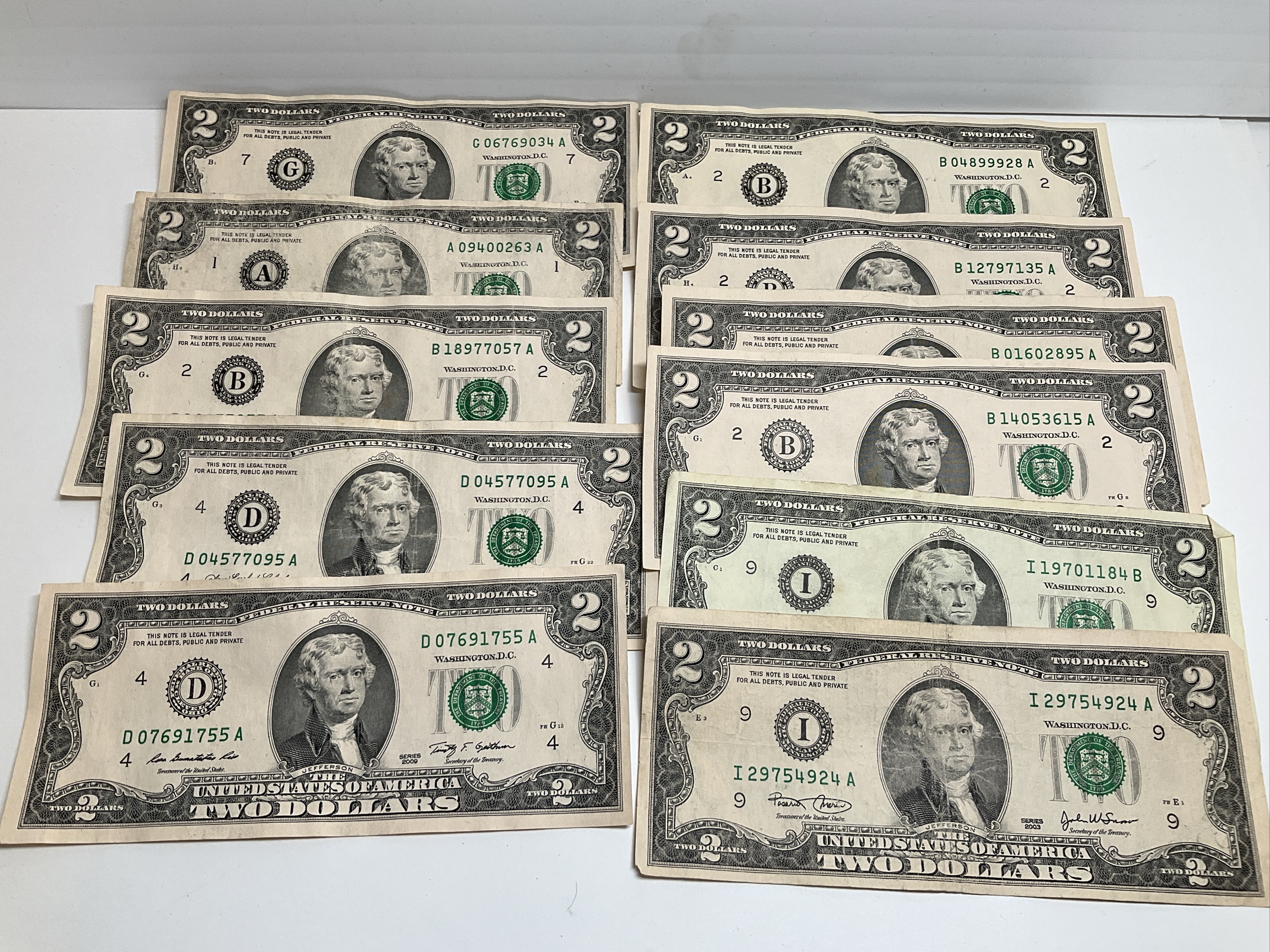 This lot features eleven United States two-dollar bills. These bills depict Thomas Jefferson on the obverse and the signing of the Declaration of Independence on the reverse. A great collection for numismatists or collectors.