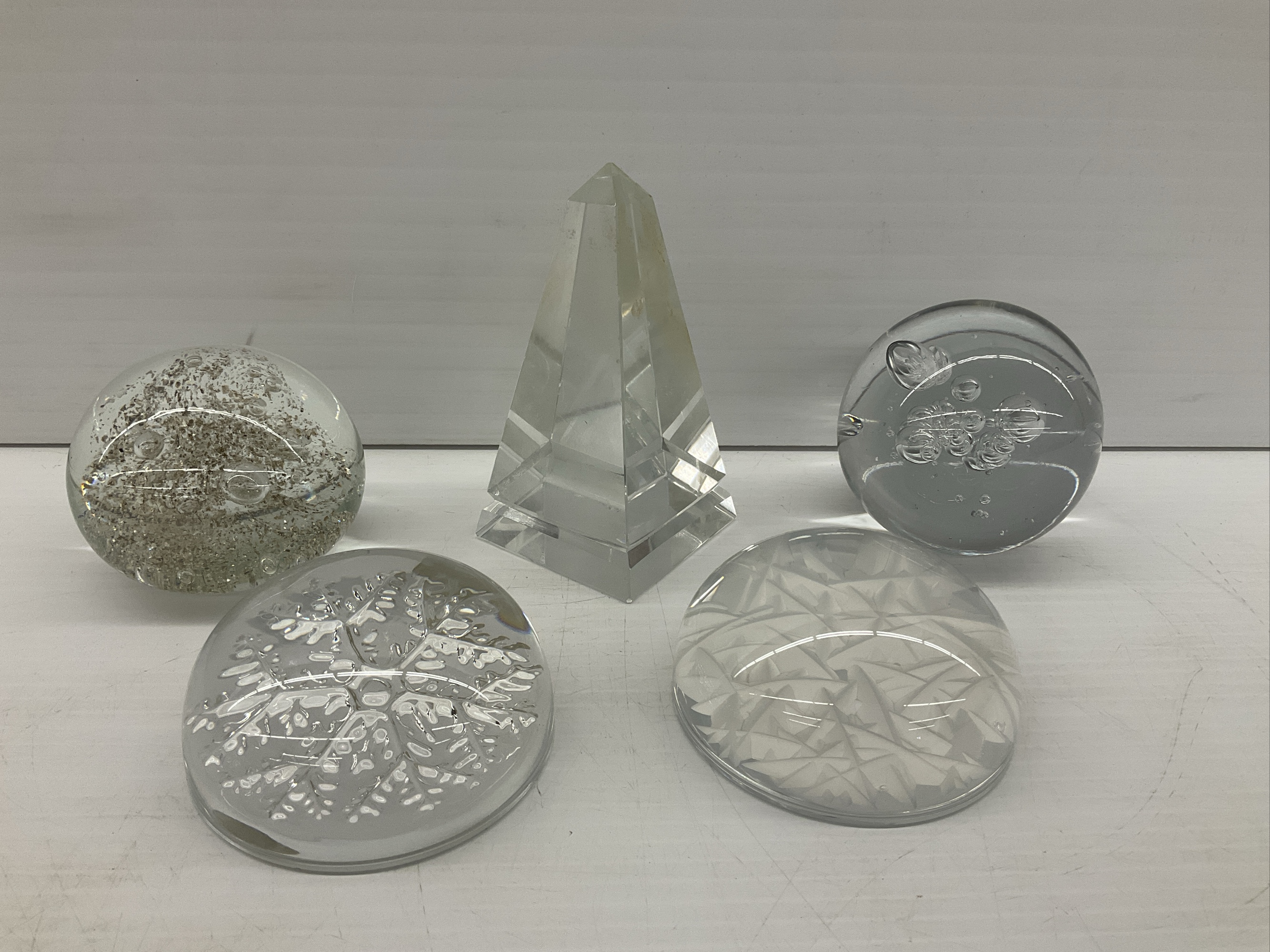 Collection of Five Lead Crystal Paperweights - Obelisk and Spherical Designs