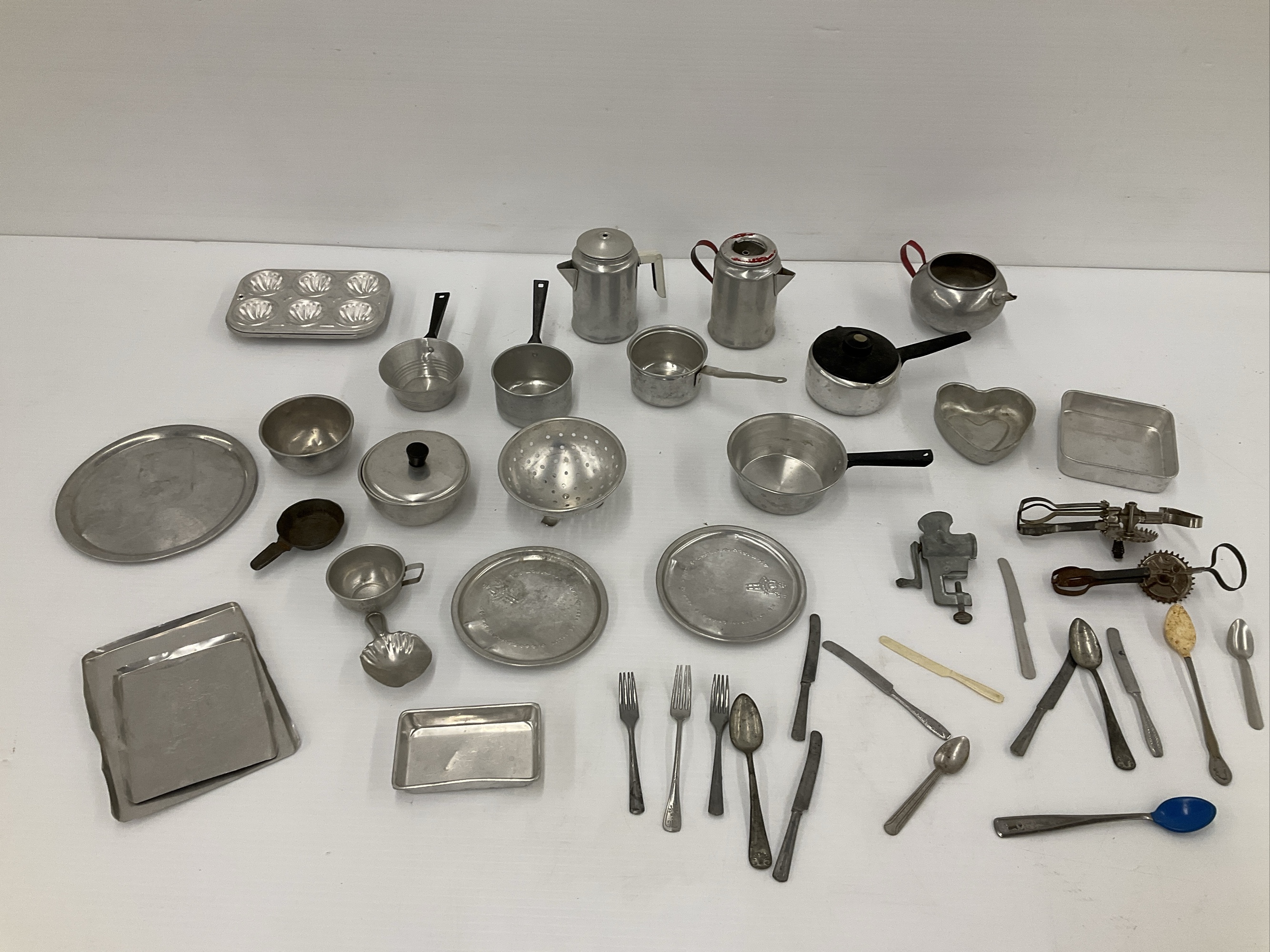 Collection of aluminum toy kitchen cookware. Includes pots, pans, serving trays, utensils and other accessories.