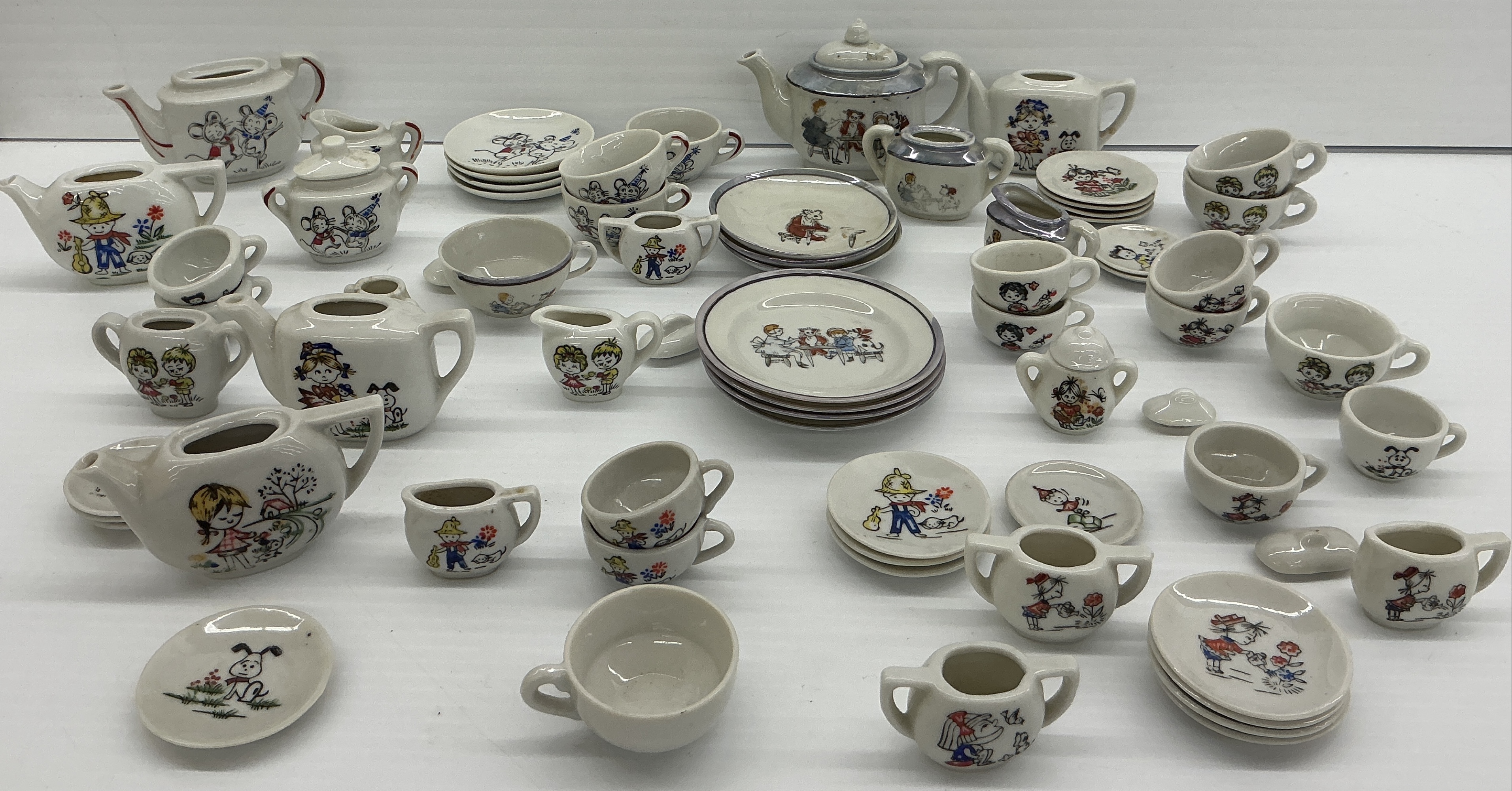 Collection of ceramic children's tea set pieces. Each piece is decorated with hand painted characters and is stamped with 'Made in Japan' on the bottom. Tallest 3.5 in.