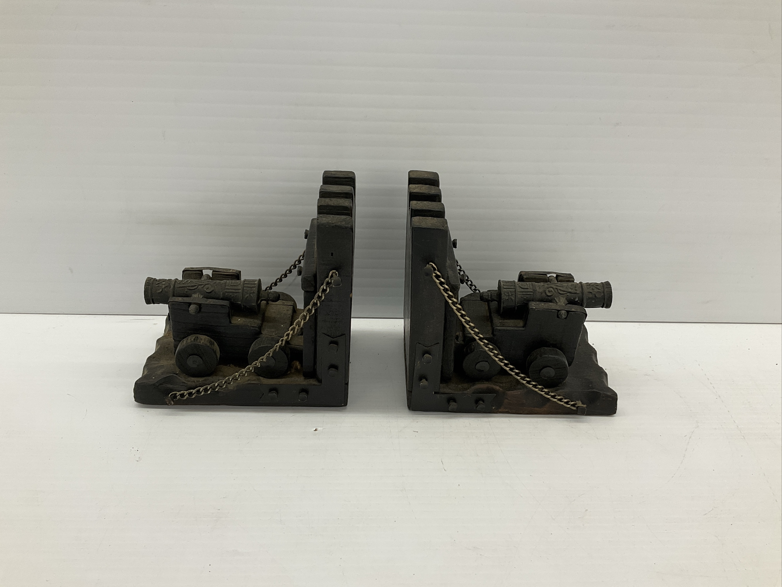 Pair of cast bookends featuring cannons and decorative chains. 6 x 6 x 5 in.