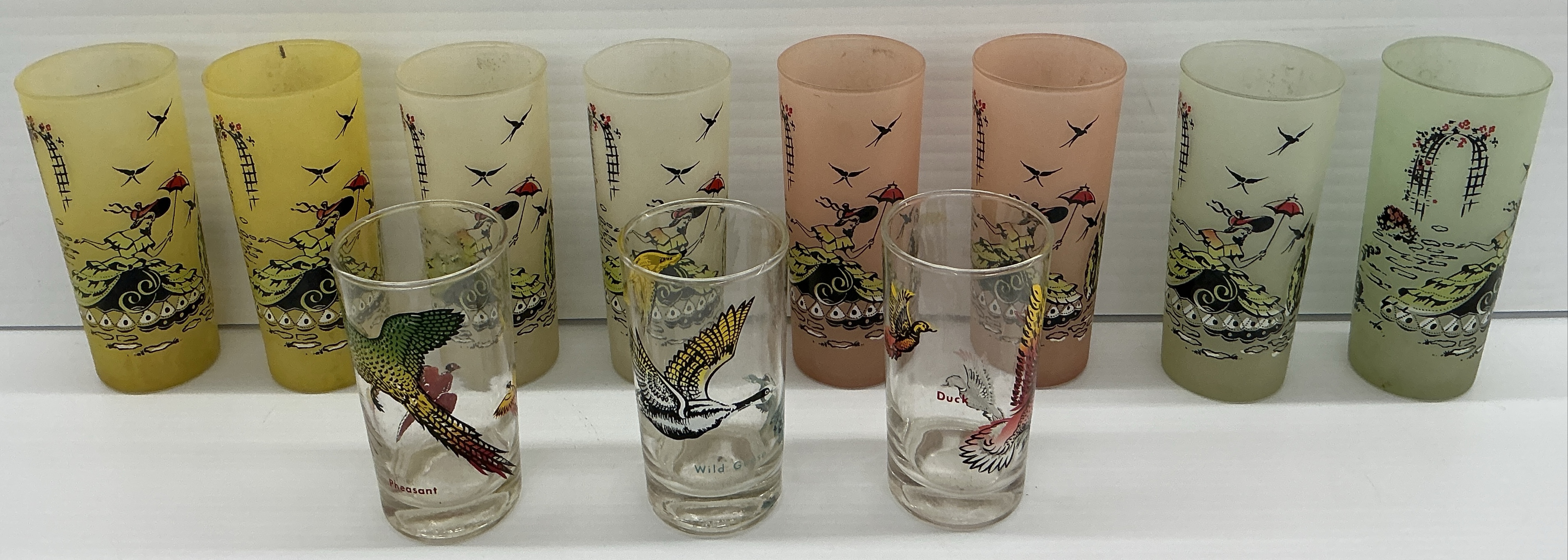 This is a group of 11 vintage drinking glasses. They feature a range of designs, including colorful birds and ladies with umbrellas. Tallest 6.5 in.