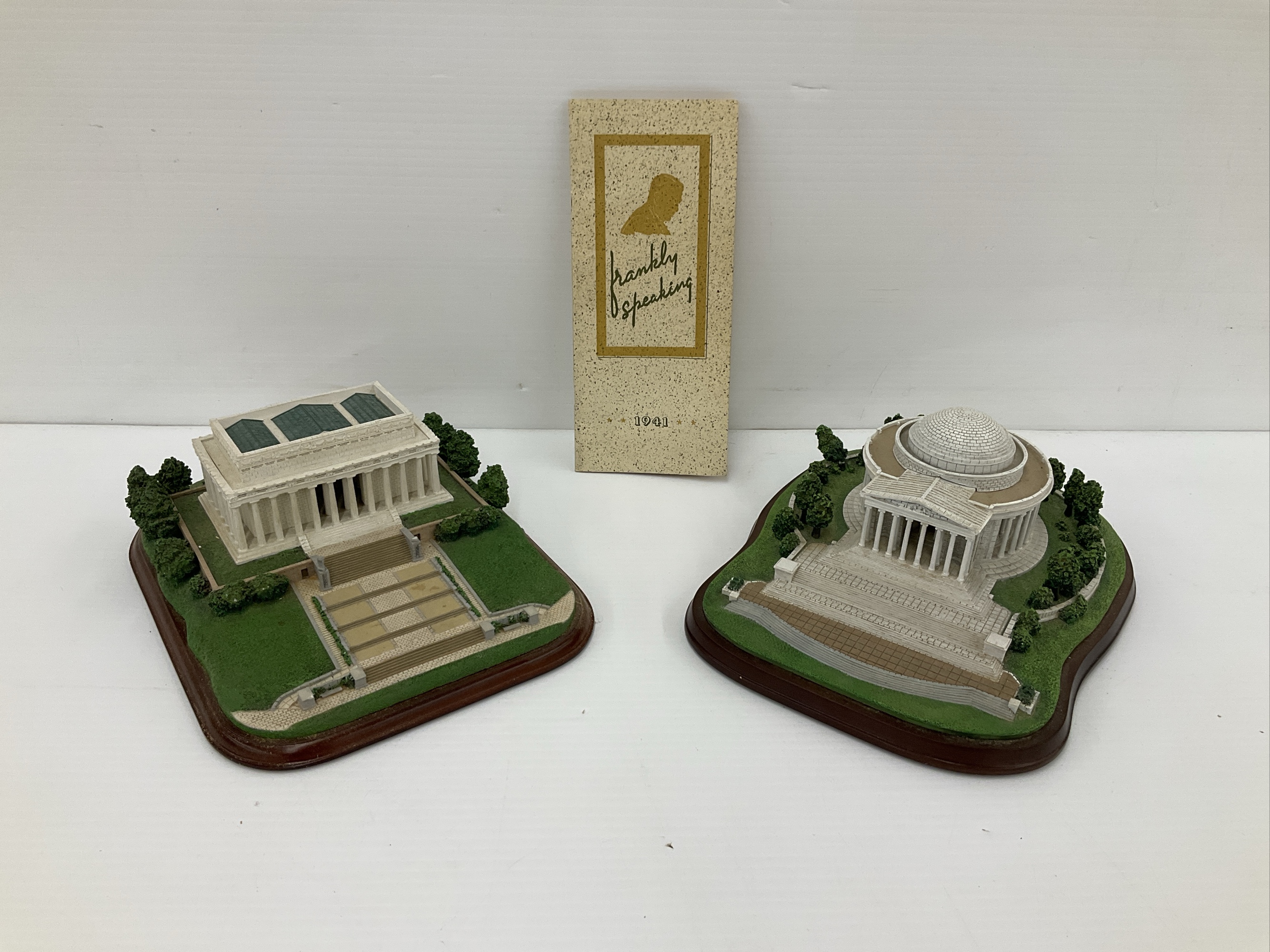 This lot includes two Danbury Mint memorial replicas of the Lincoln and Jefferson Memorials in Washington D.C. Also included is a book titled Frankly Speaking, published in 1941.