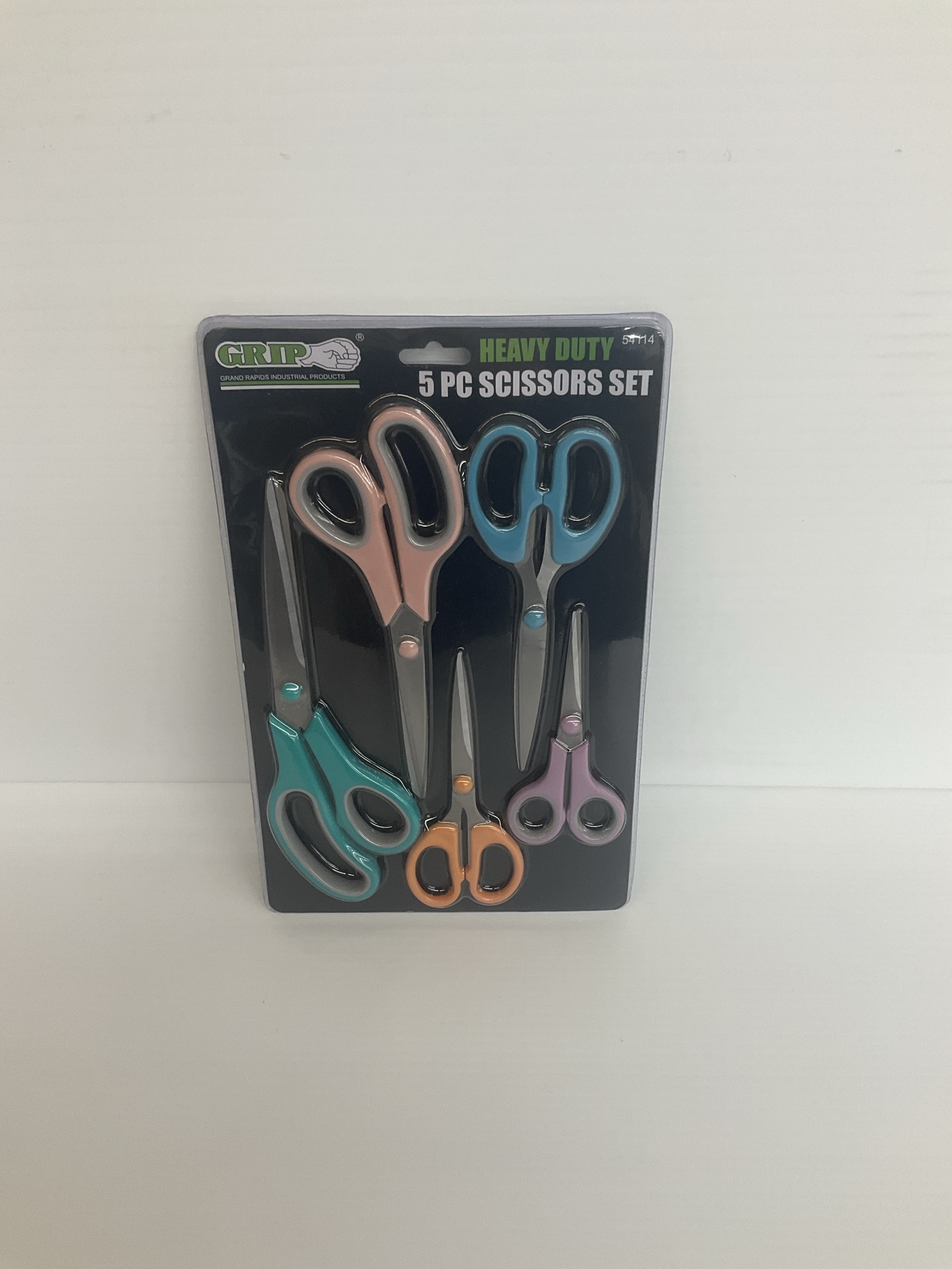 New in package Grip 5-piece heavy duty scissors set. Includes various sizes and styles for different cutting tasks. Perfect for home, office, or workshop use.
