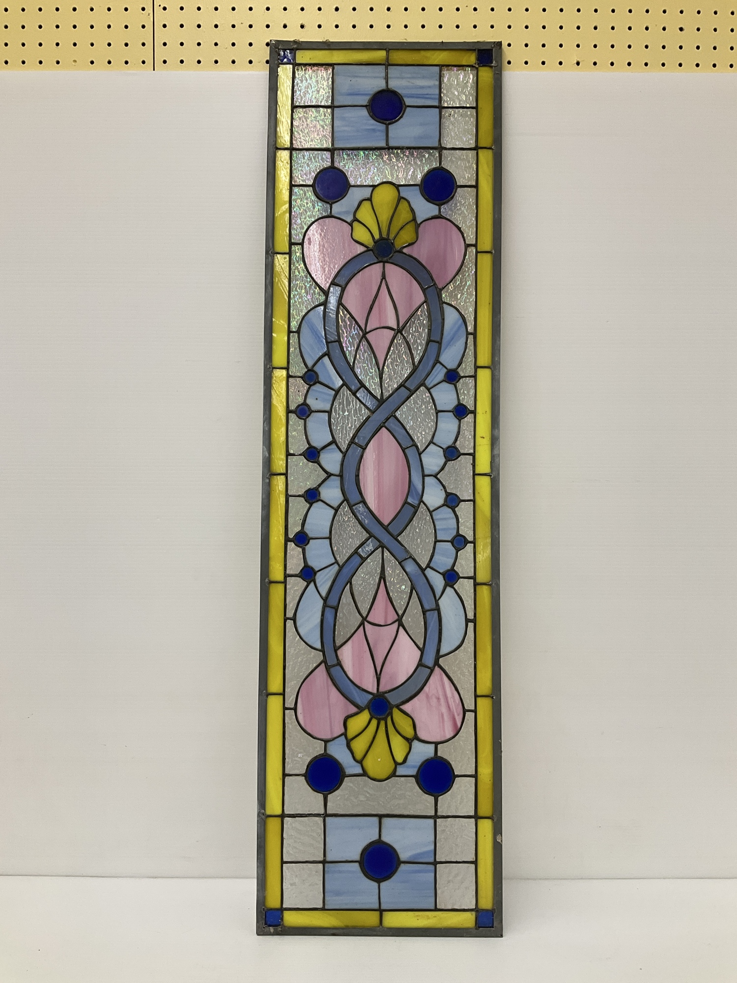 This auction features a decorative stained glass window panel. The design incorporates floral motifs in pink, blue, yellow and clear glass, framed by a leaded border. 50 x 13 in.