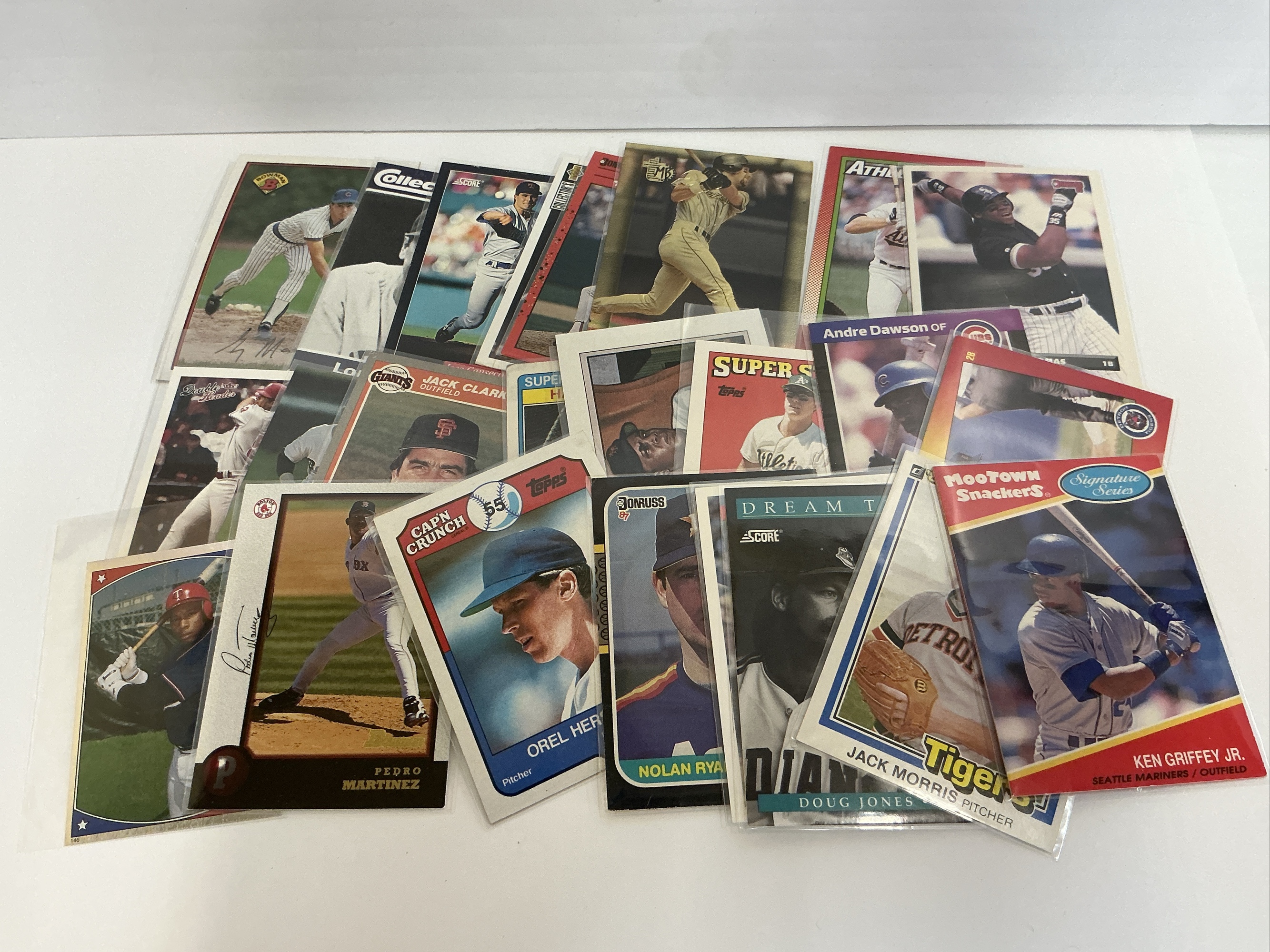 Collection of baseball trading cards featuring various players from different teams and years. Includes stars such as Ken Griffey Jr., Frank Thomas, and Nolan Ryan. A mix of brands and sets are represented in this collection.