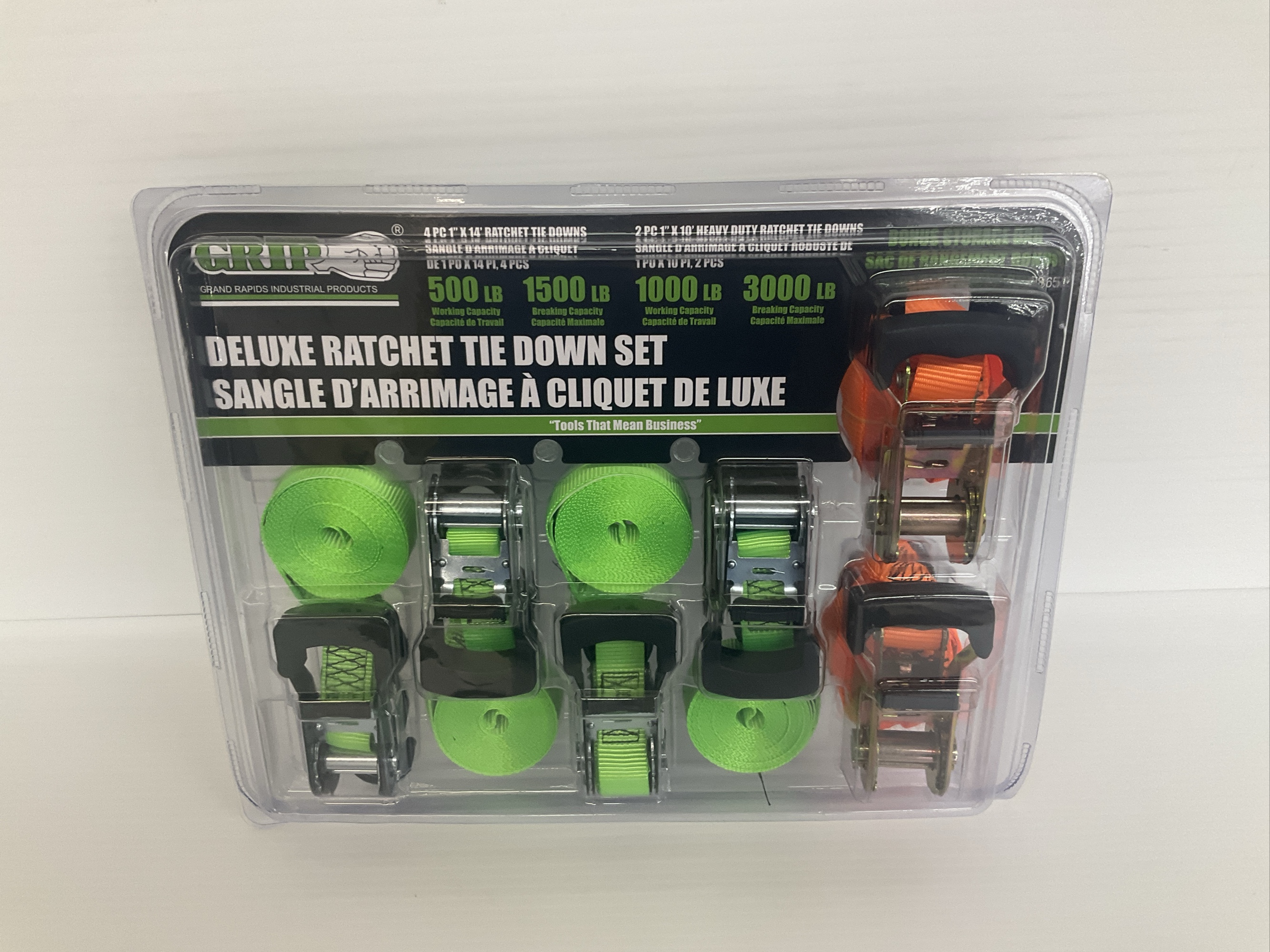 Deluxe ratchet tie down set by Grip. Includes 4 pieces of 1 x 14 foot tie downs and 2 pieces of 1 x 10 foot heavy duty ratchet tie downs. Features rubber coated S type hooks to protect the vehicle from scratches.