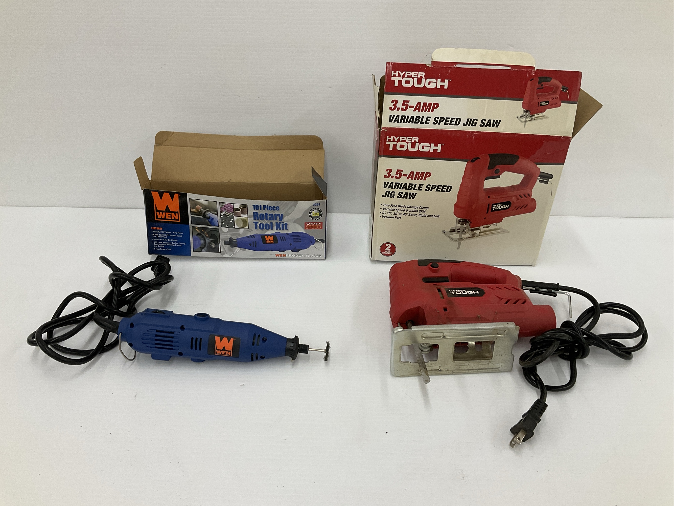 Includes a Hyper Tough 3.5-Amp Variable Speed Jig Saw and a Wen 101 Piece Rotary Tool Kit.