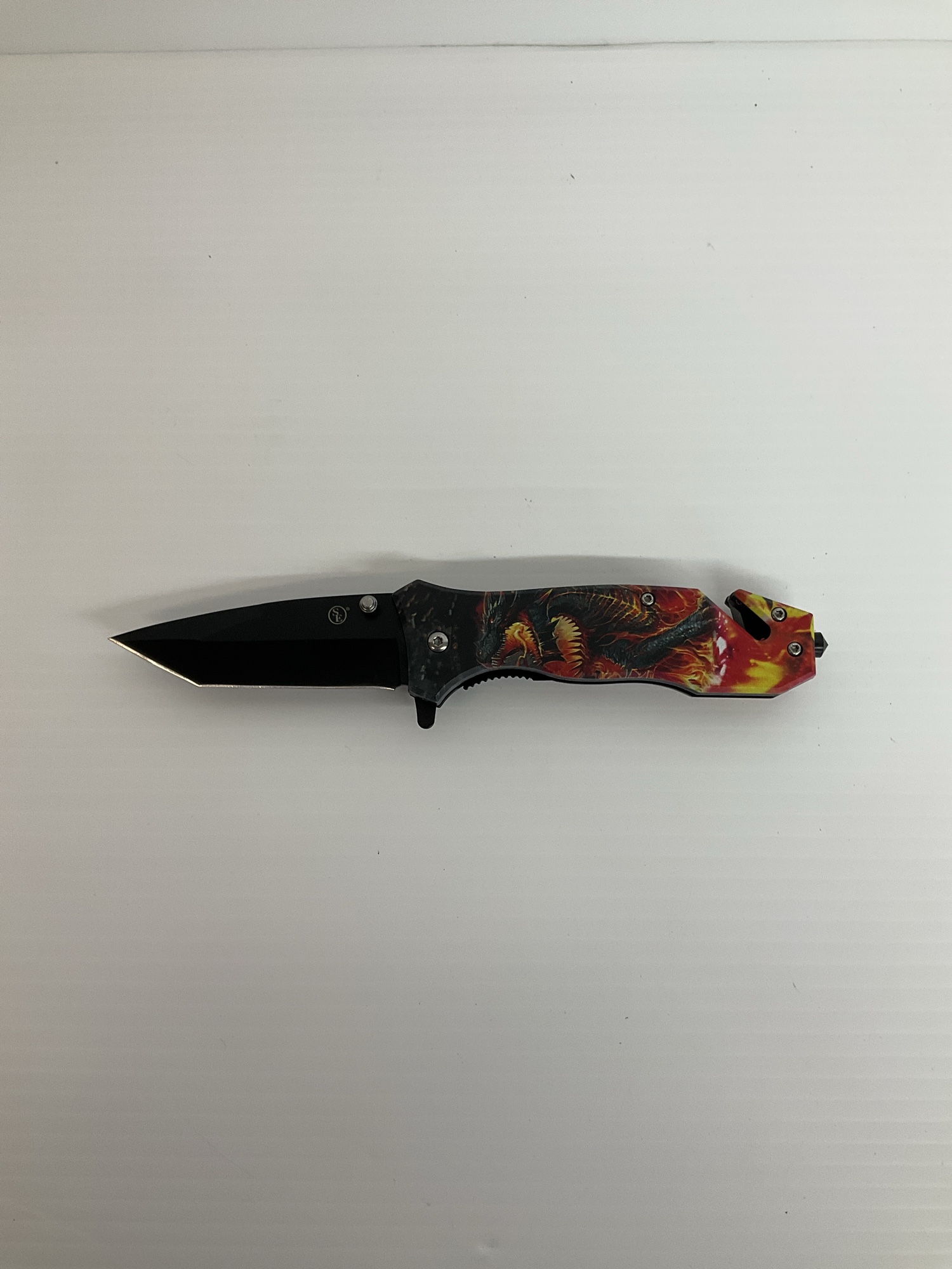 This listing features a folding pocket knife with a black blade and a decorative handle depicting a dragon design in vibrant colors. The knife appears to have a rescue hook tool.