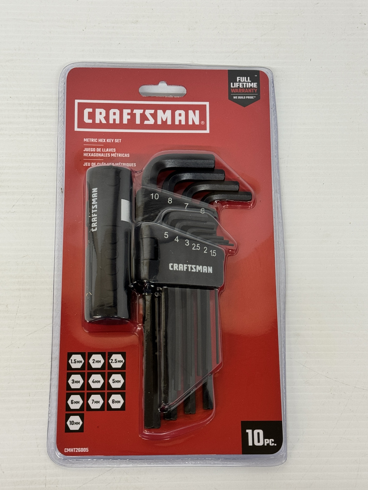 This listing includes a Craftsman 10-piece metric hex key set. The set includes sizes ranging from 1.5mm to 10mm. The keys are made of strong steel with a black oxide coating. The storage rack keeps the set intact.