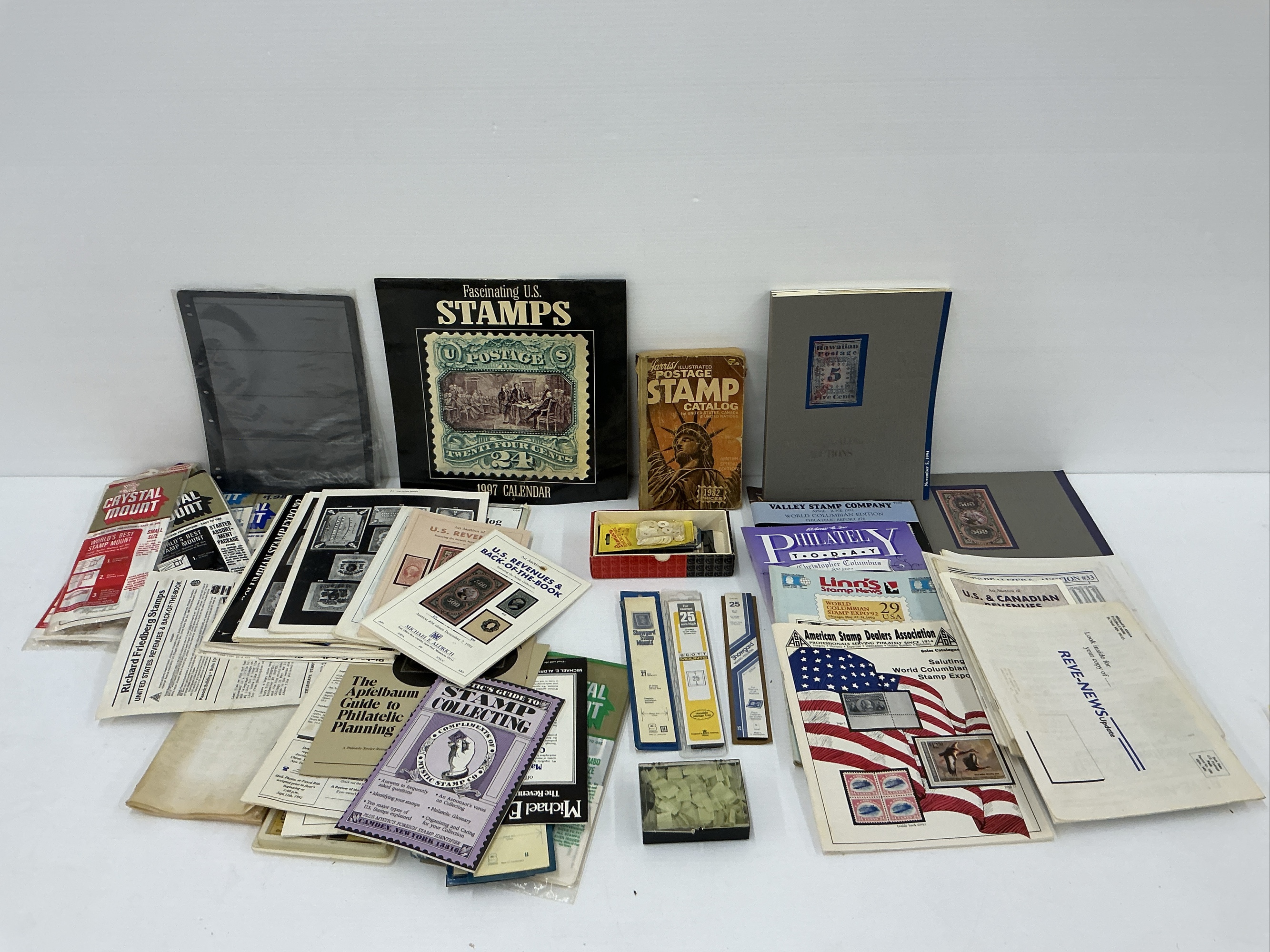 Assorted lot of stamp collecting supplies and related printed materials. Includes stamp mounts, guides, catalogs, and reference materials. A great starting point for beginners or a useful addition to any philatelist's collection.