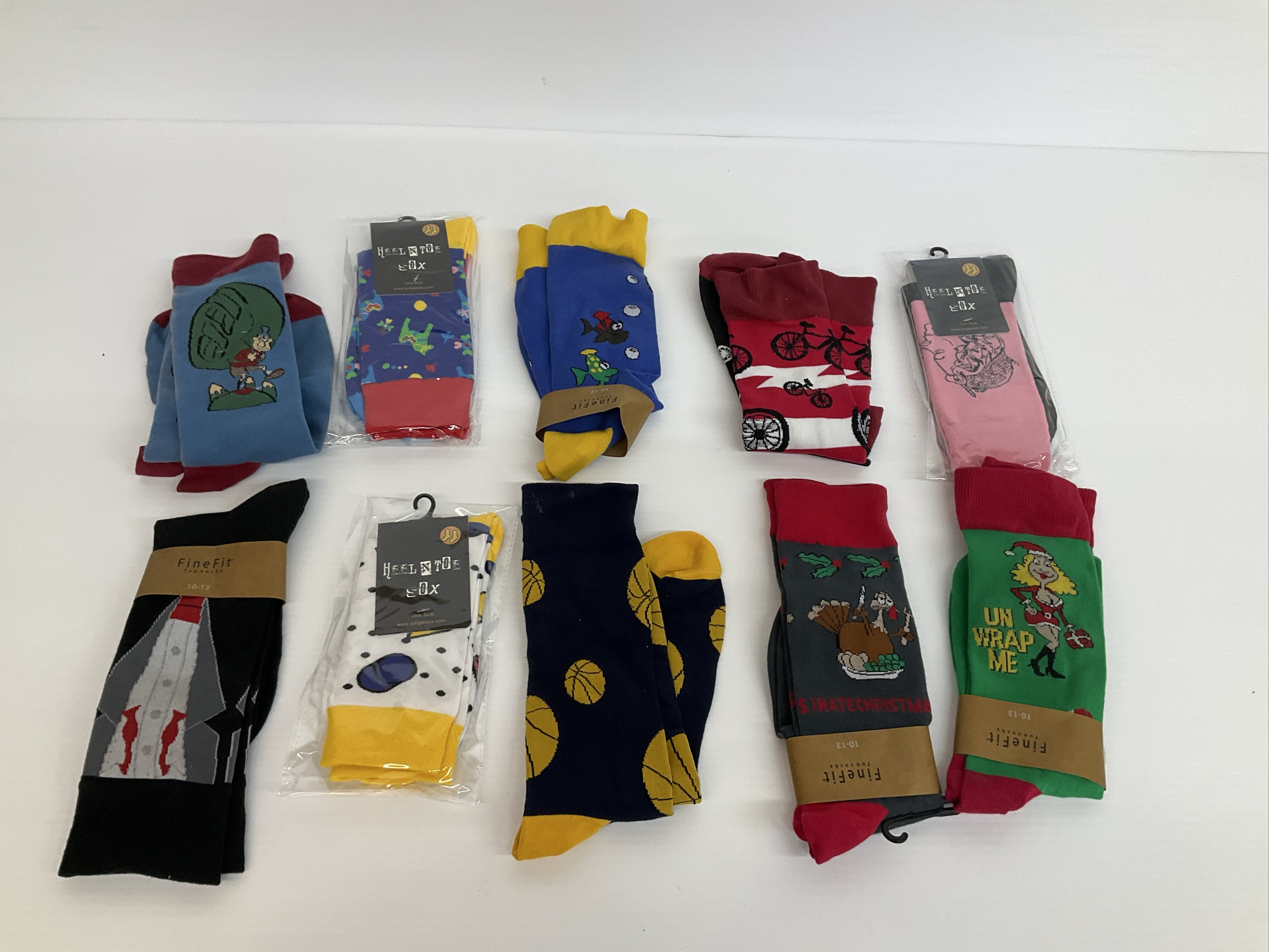 This lot includes a variety of fun and unique novelty socks. There are 10 pairs of socks with assorted patterns including rockets, cartoon characters, dinosaurs, cars, and holiday themes. One size and 10/13. Perfect for adding some personality to your wardrobe!