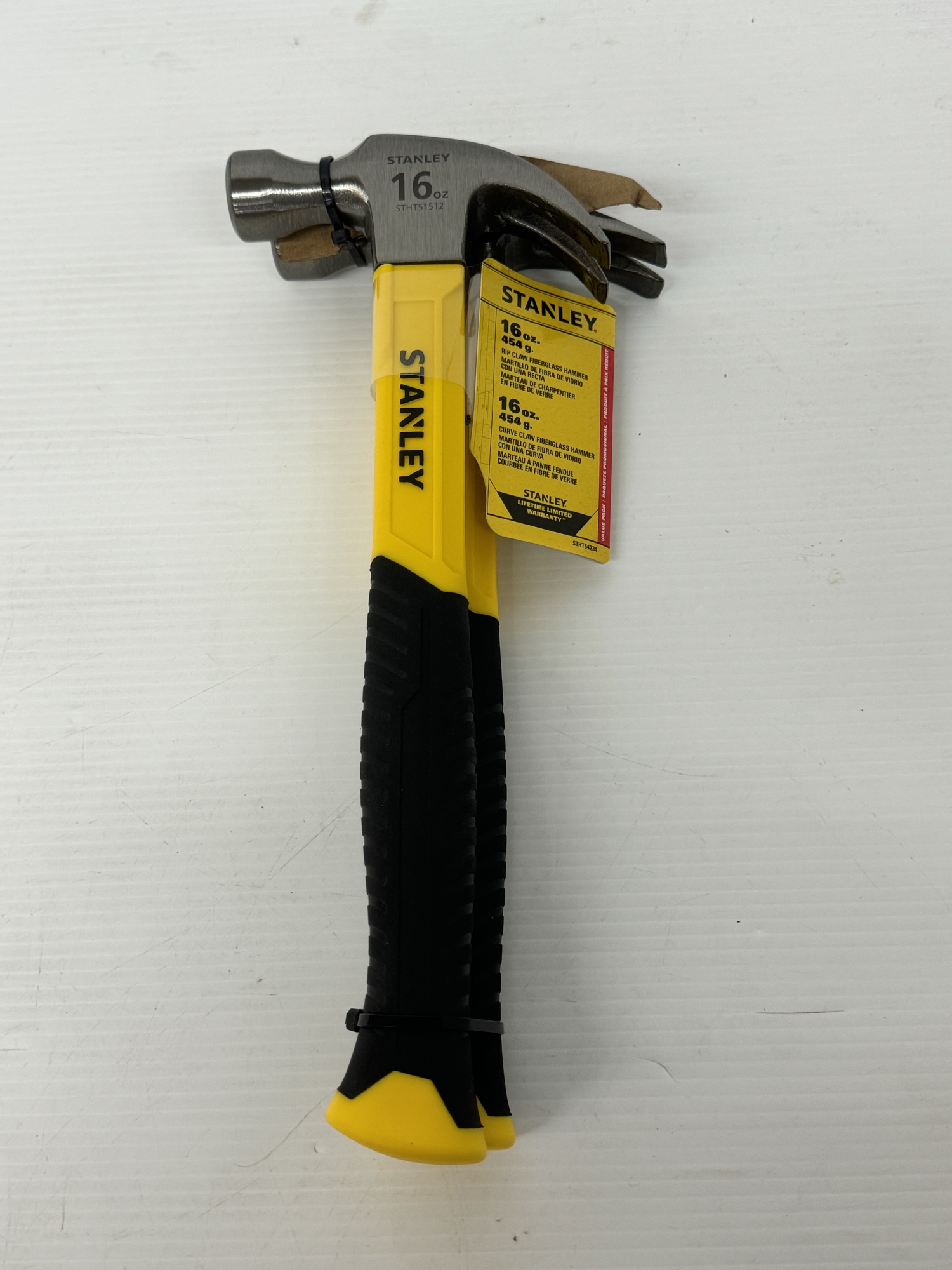 This lot includes two new Stanley 16oz fiberglass claw hammers. One is a rip claw hammer and the other is a curve claw hammer.