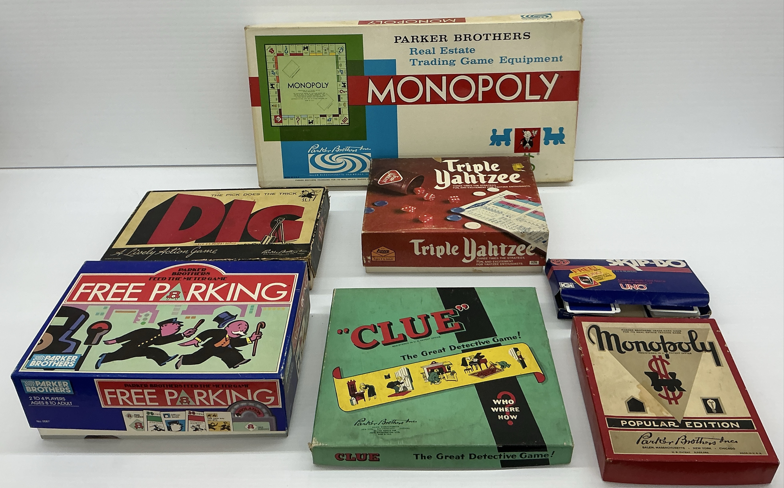 Collection of 7 vintage board games, including Monopoly, Clue, Dig, Triple Yahtzee, Free Parking, and Skip-Bo. Includes pieces and instructions. Sold as is.