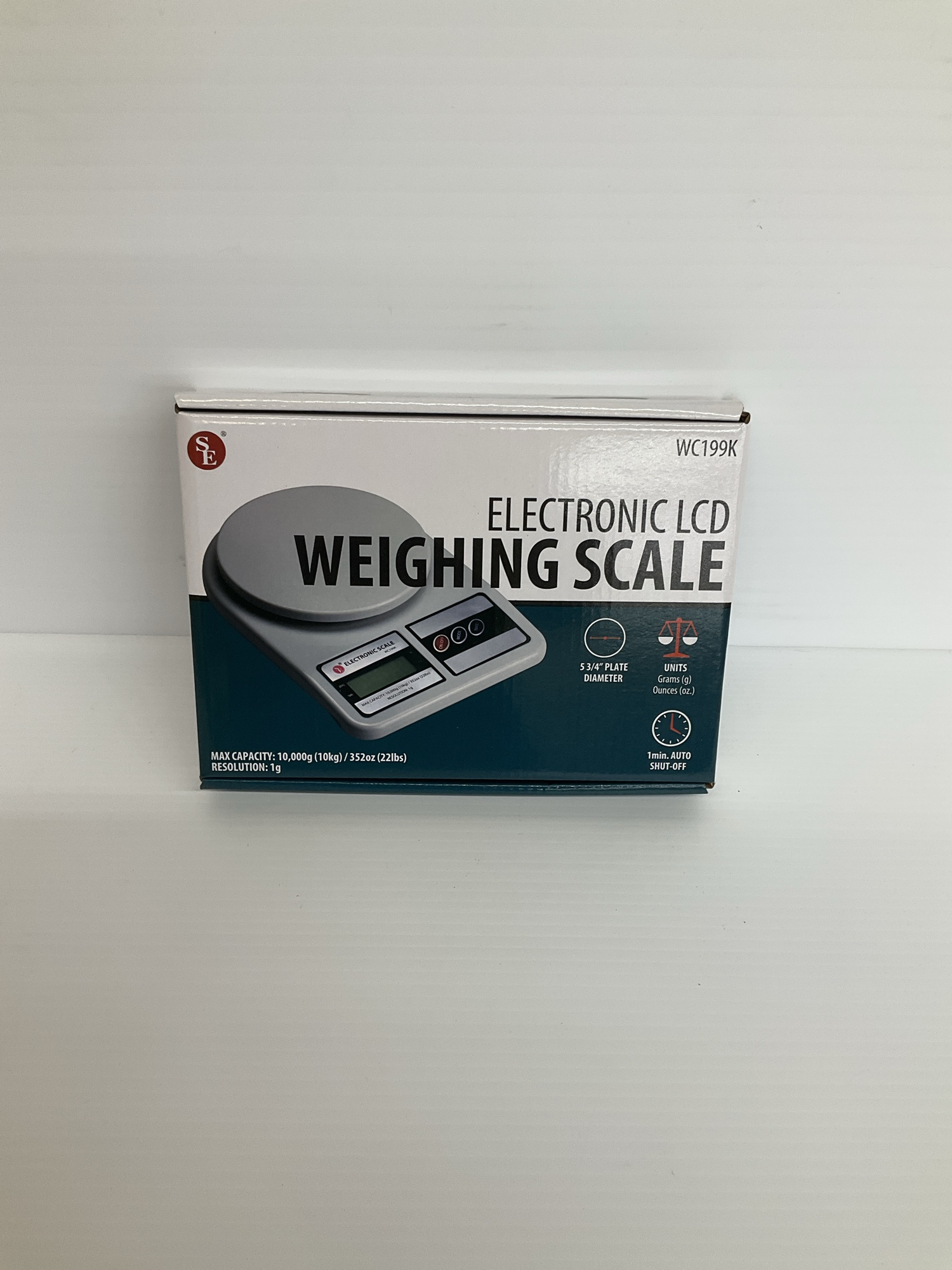 Brand new electronic LCD weighing scale with a 10kg/352oz capacity and 1g resolution. Features a power button, tare button and overload/low battery warnings.