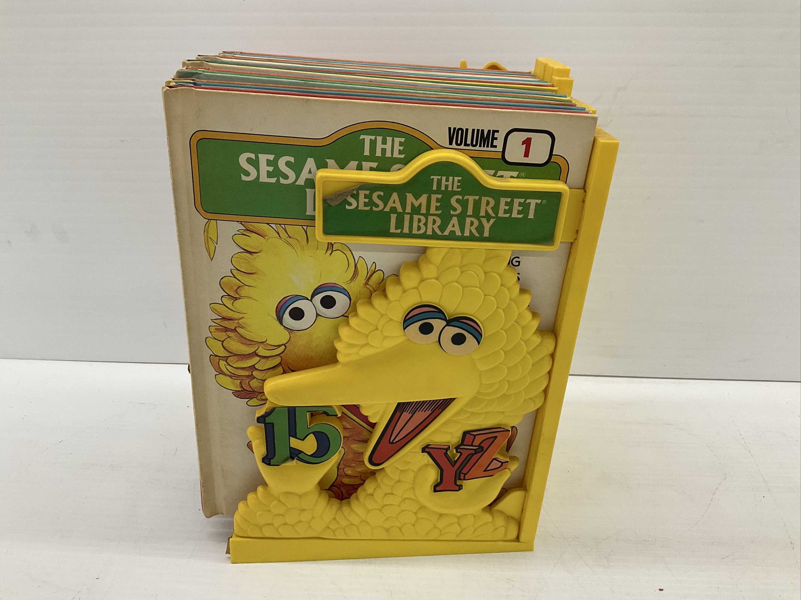 This is a vintage set of 15 Sesame Street Library books. The books are held in a yellow plastic case with Big Bird detailing.