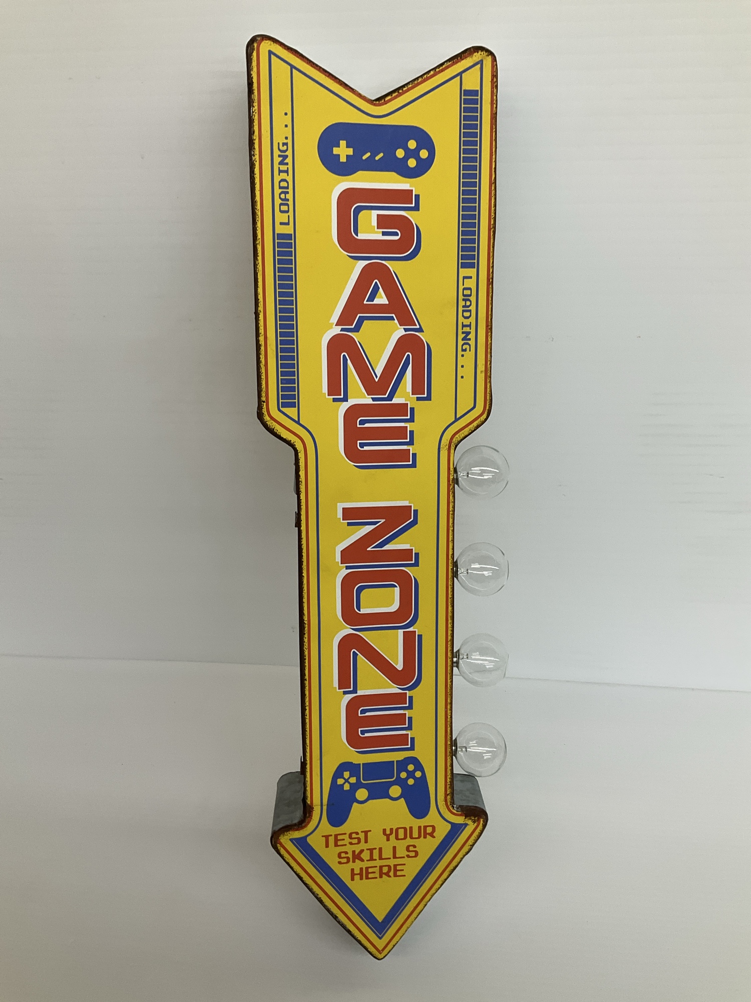 Decorative Game Zone arrow sign featuring lightbulbs and a yellow and red color scheme. 26 in. tall