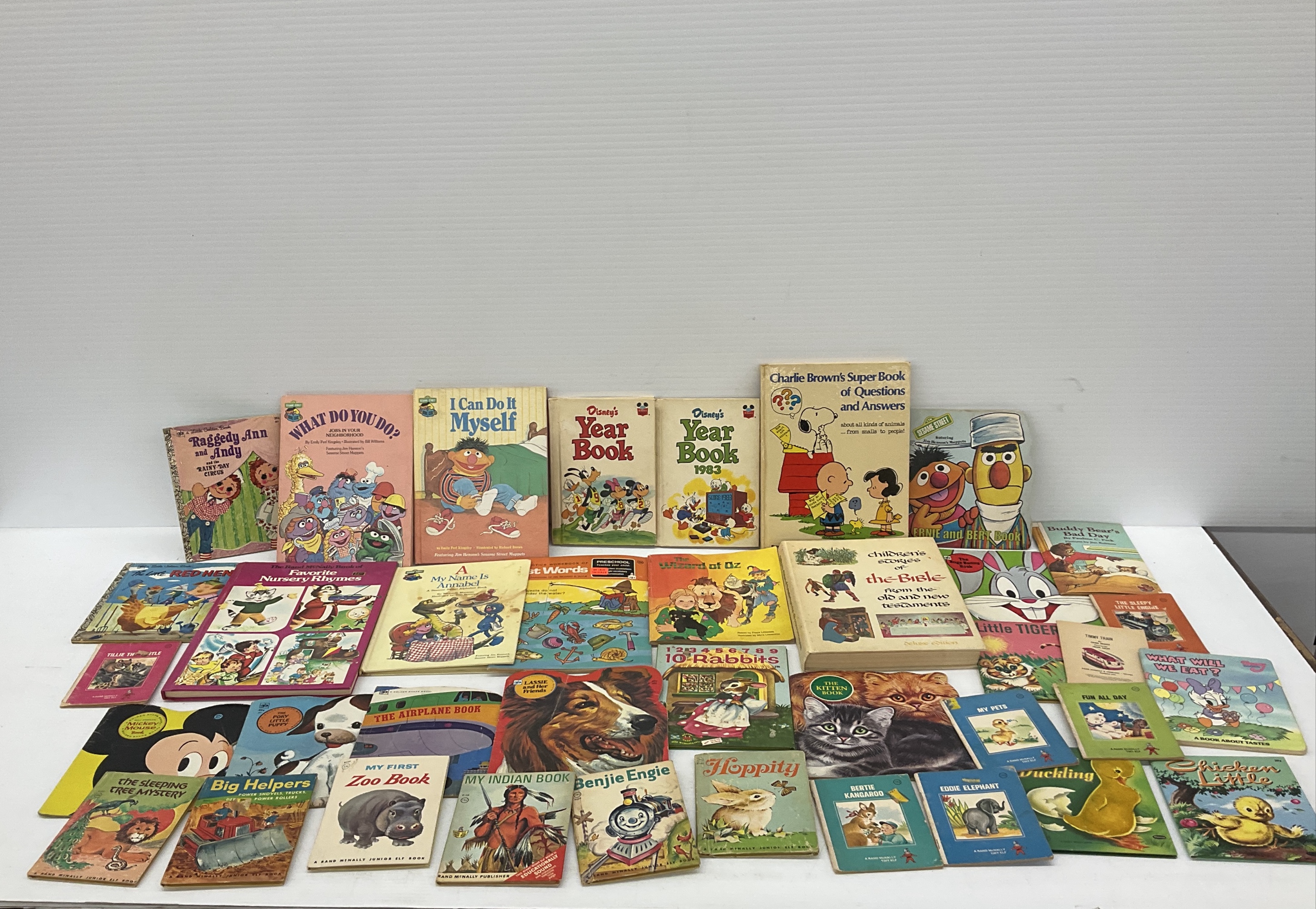 Collection of children's books, including Rand McNally Junior Elf books, Golden Press Little Golden Books, Disney yearbooks, Sesame Street books, and various others.
