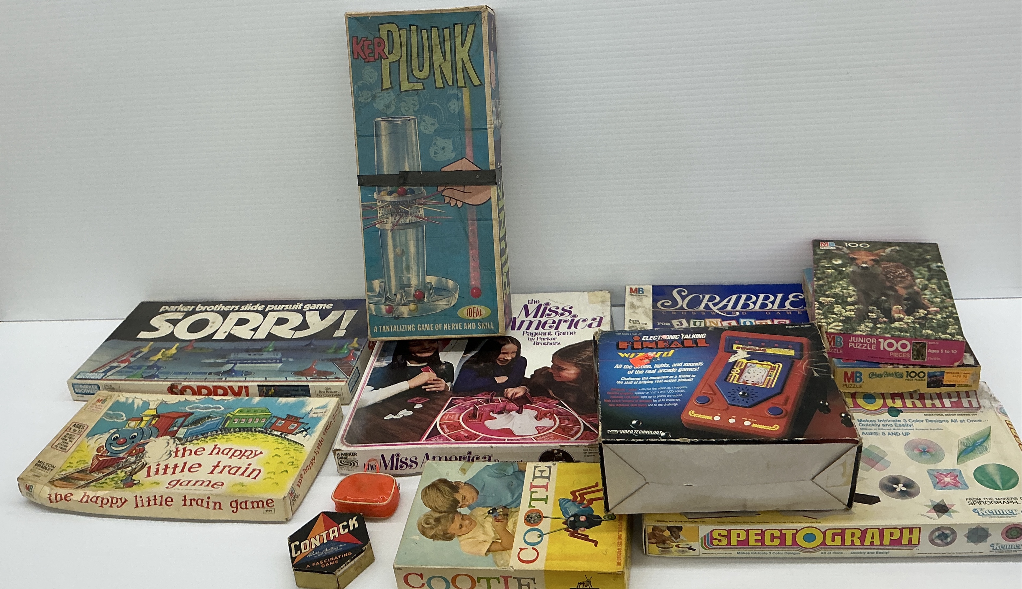This lot features a collection of classic board games and puzzles. Includes Cootie, Sorry!, Ker Plunk, Miss America, Electronic Talking Pinball, The Happy Little Train Game, Spectrograph, Scrabble for Juniors, Contact, and puzzles. Some are missing pieces.