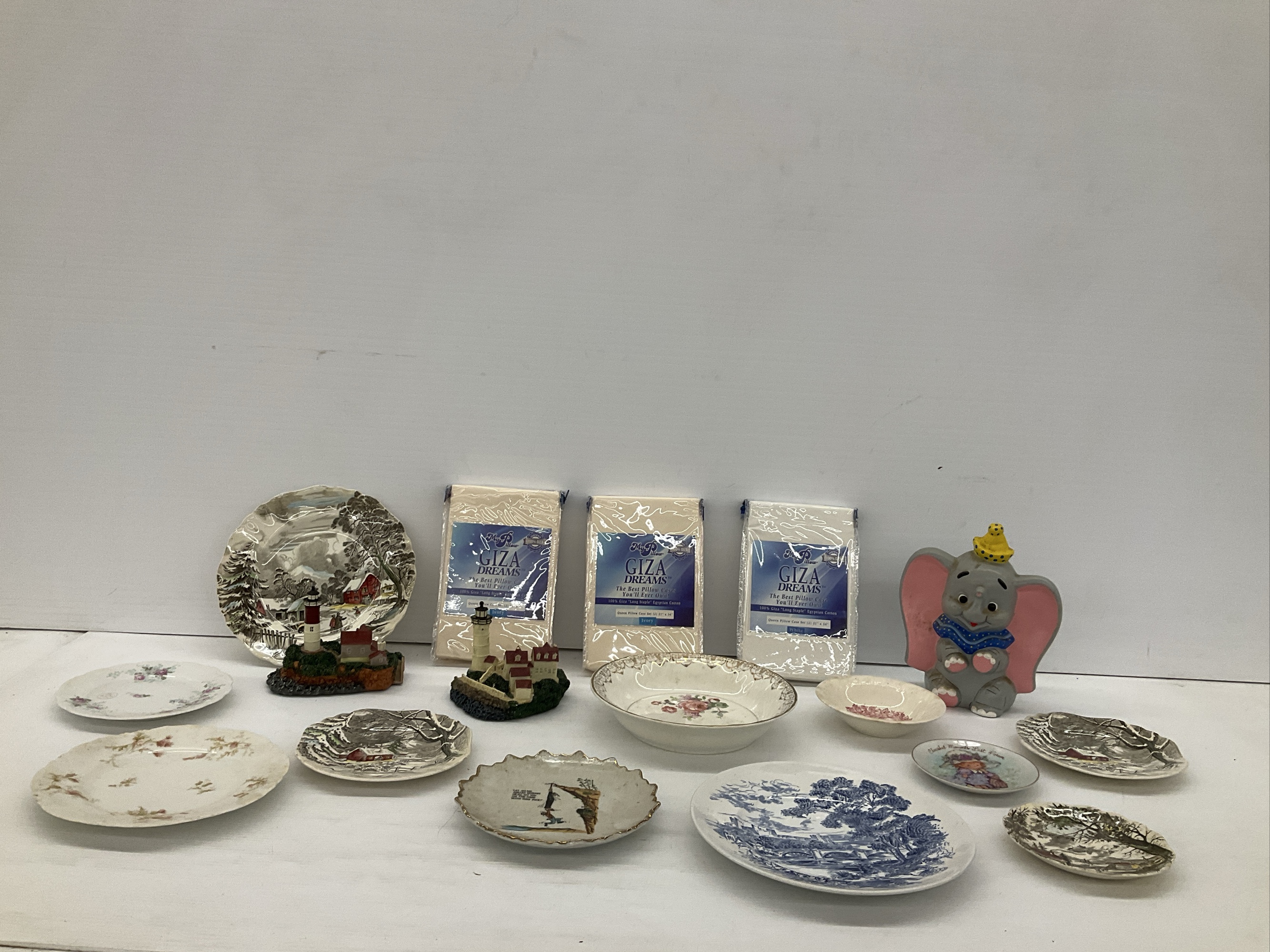 Assorted lot featuring collectible plates including English Staffordshire and MZ Austria (5 - 10 in. dia.), lighthouse figurines, Giza Dreams pillowcases, and a Dumbo figurine.