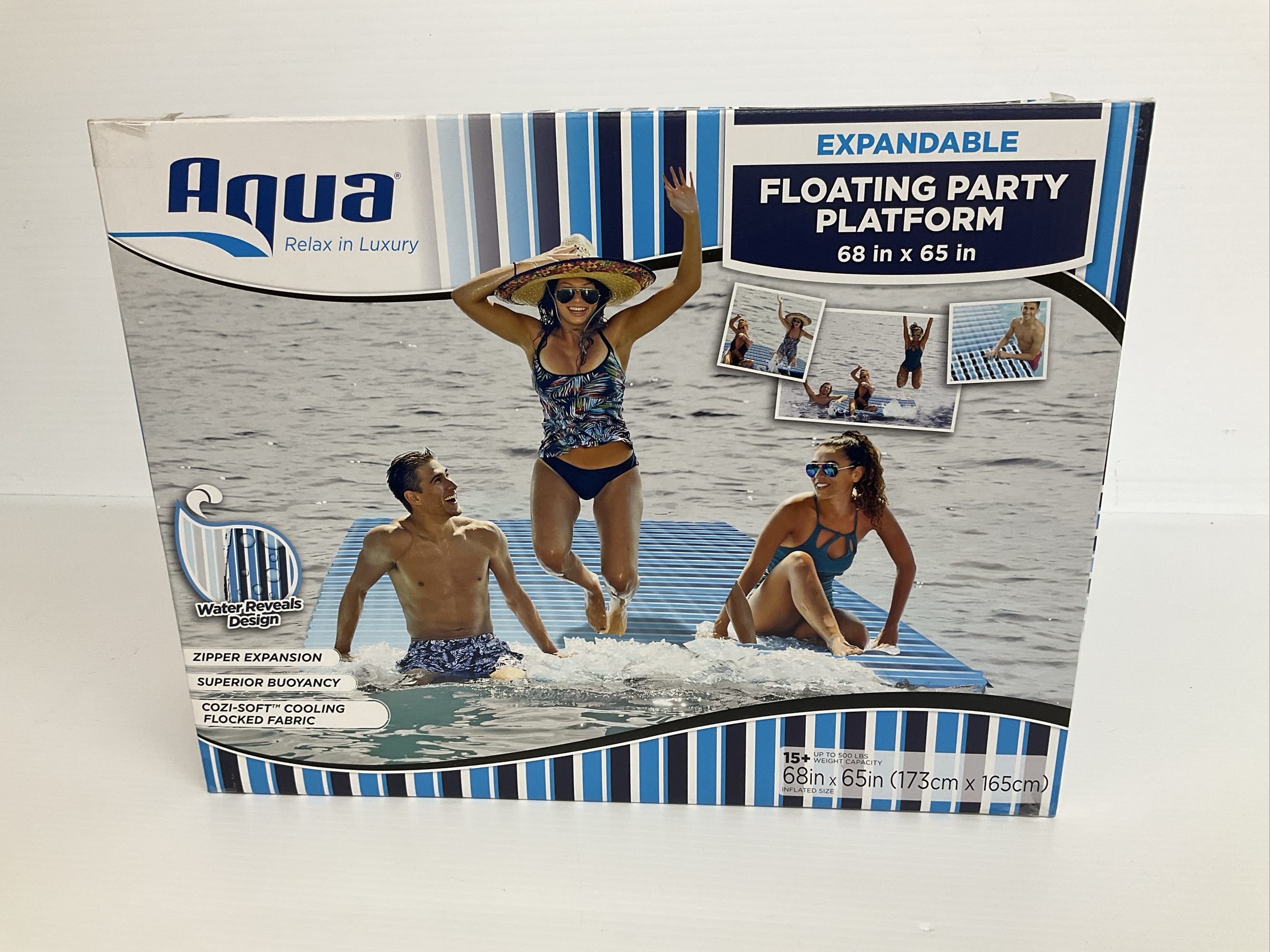 Aqua Expandable Floating Party Platform measures 68 x 65 inches. Features Cozi-soft cooling flocked fabric, heavy-duty construction, and mooring loops. Includes zipper expansion and Boston valve.