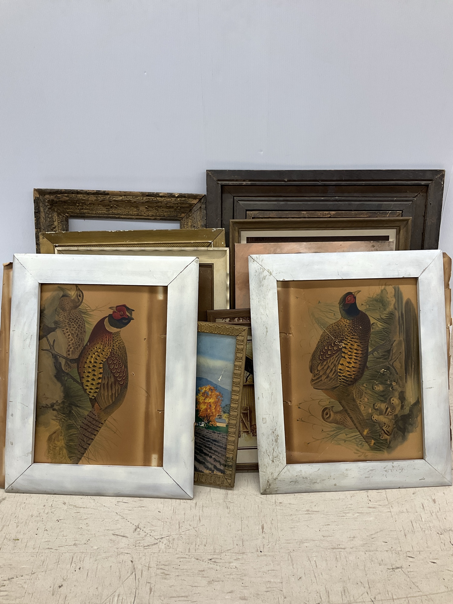 This collection features a variety of framed artwork and wall decor pieces. Includes prints, paintings, and decorative frames showcasing different subjects like landscapes, portraits, floral arrangements, and architectural scenes. Largest 30 x 26 in.