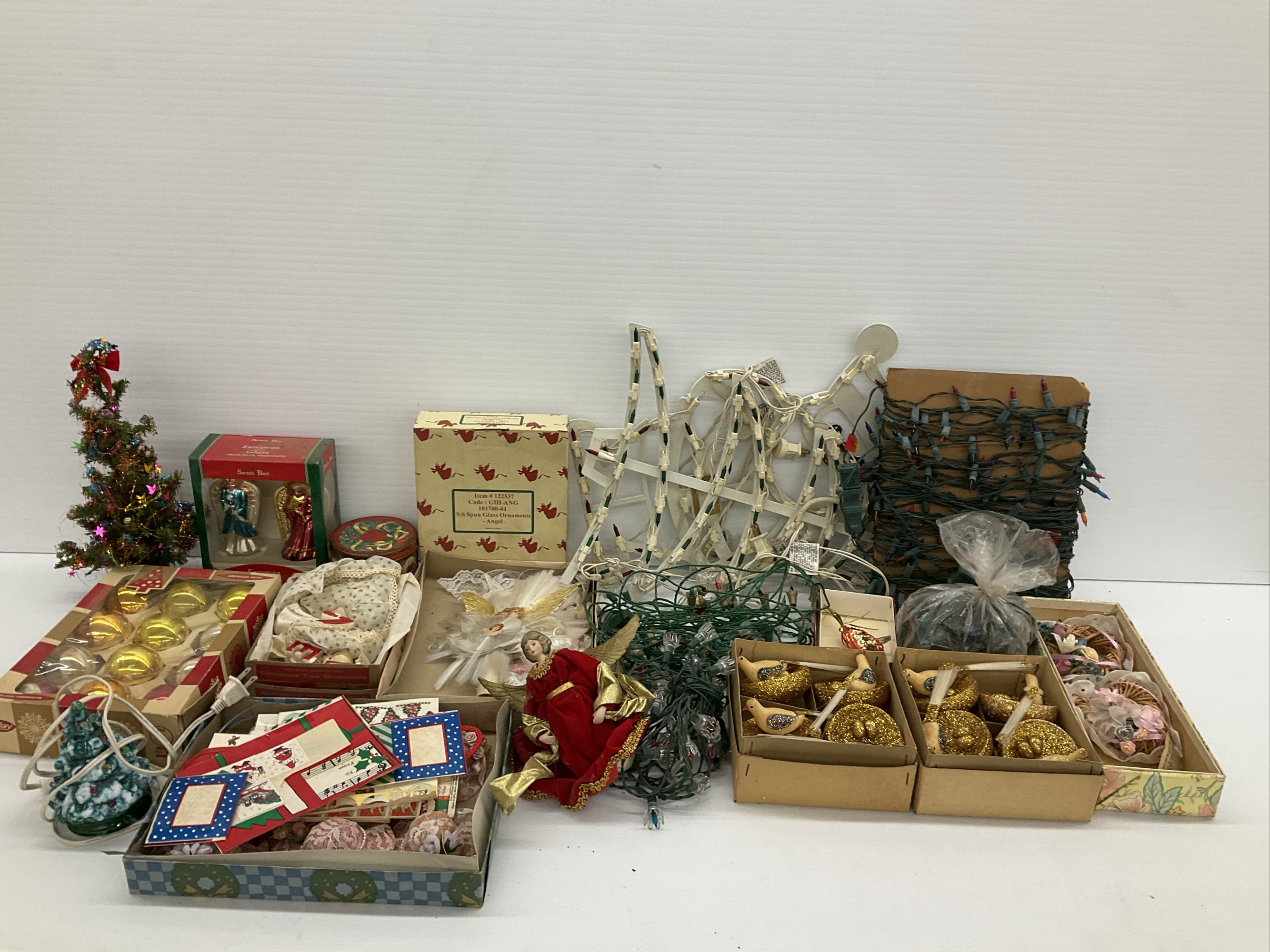 Large collection of Christmas decorations and ornaments. Includes string lights, angel figurines, glass ornaments, handmade ornaments, and small Christmas tree.