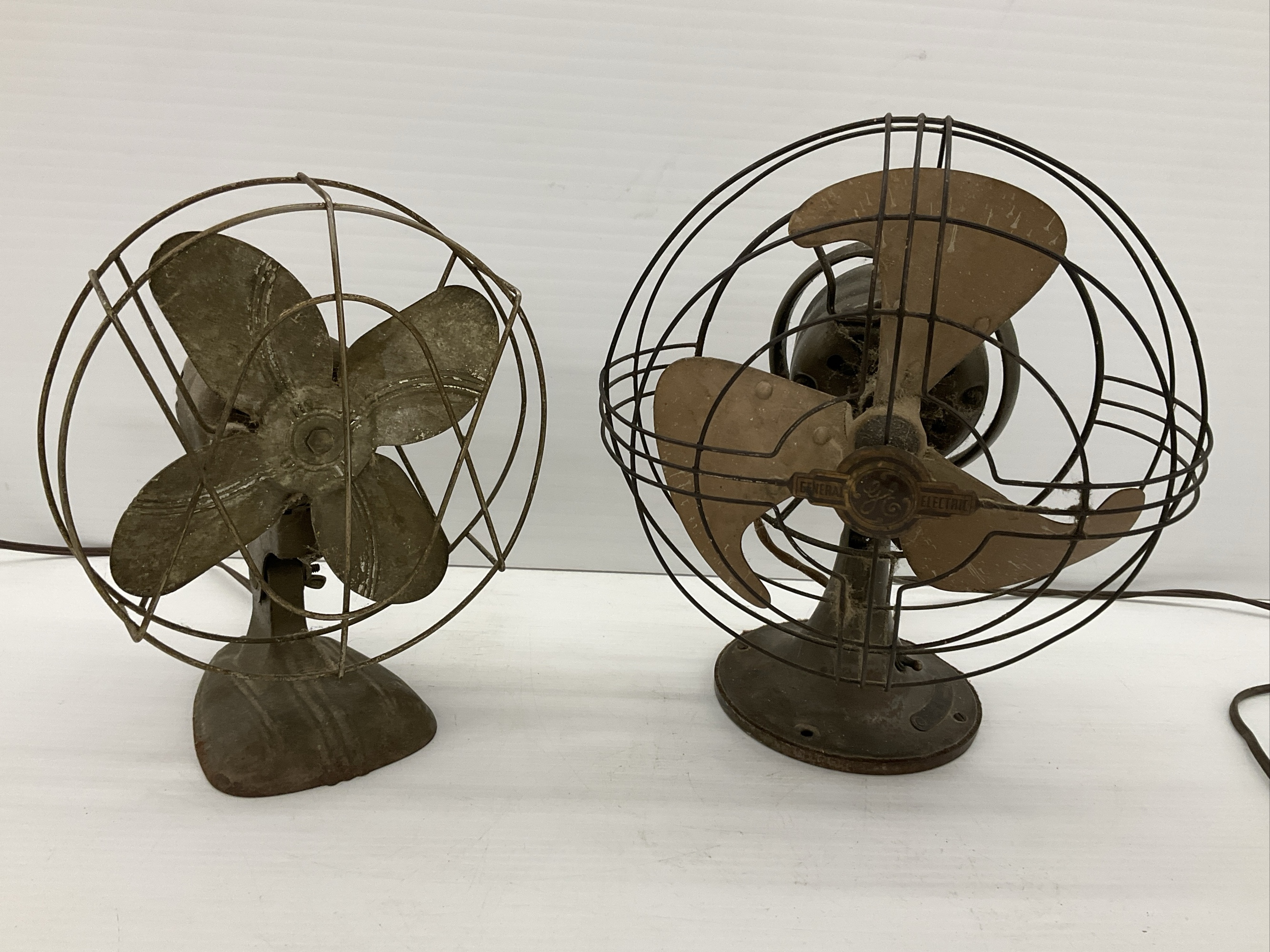 You are bidding on a pair of oscillating desk fans. One is a GE and the other is unmarked. Both fans have metal blades and cages. They have a cast iron base with a brown cord. Tallest 12 in.