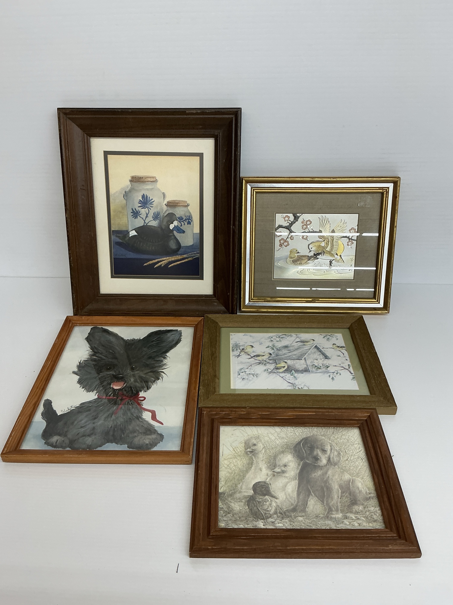 This lot features five framed prints with various nature and animal themes. Includes depictions of ducks, dogs, and birds in different artistic styles and frames. Largest 18 x 15 in.