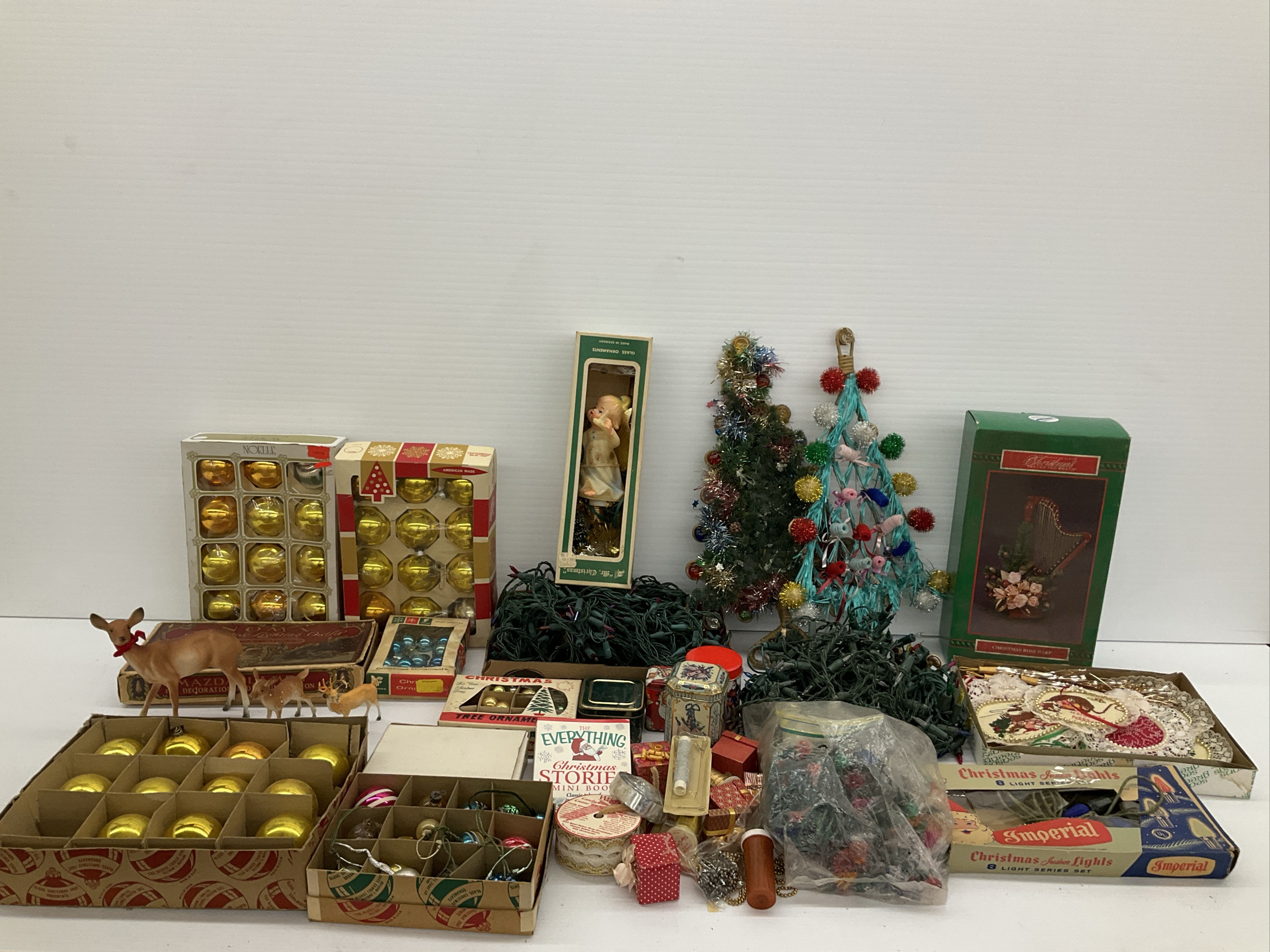 This lot includes a variety of Christmas decorations such as ornament sets, string lights, mini Christmas trees, deer figurines, and various other holiday items.
