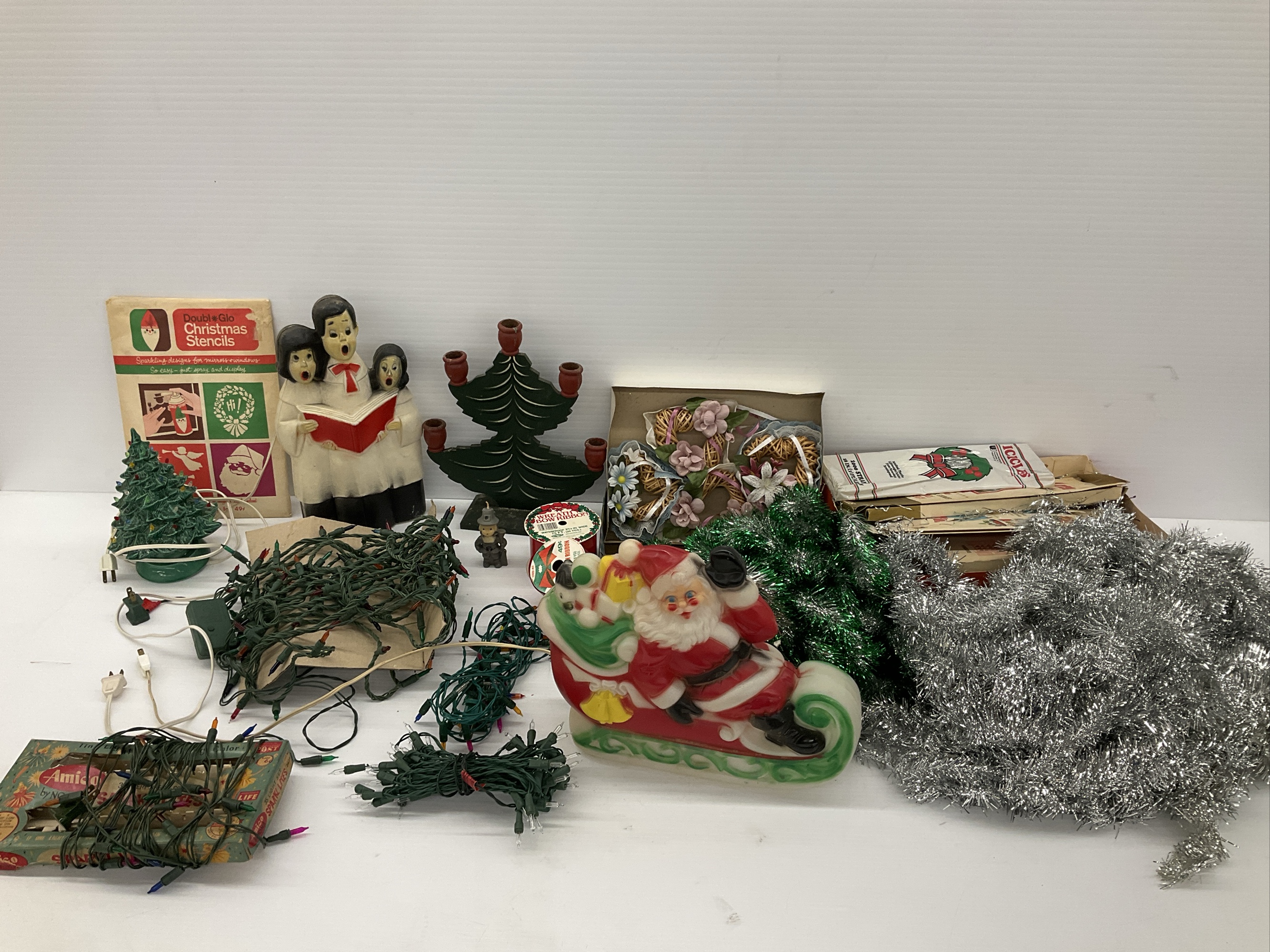 Group of assorted Christmas decorations. Includes a small ceramic light up ceramic Christmas tree, blow mold Santa Claus and Carolers, Christmas lights (work), stencils, tinsel, and other items. Tallest 14 in.