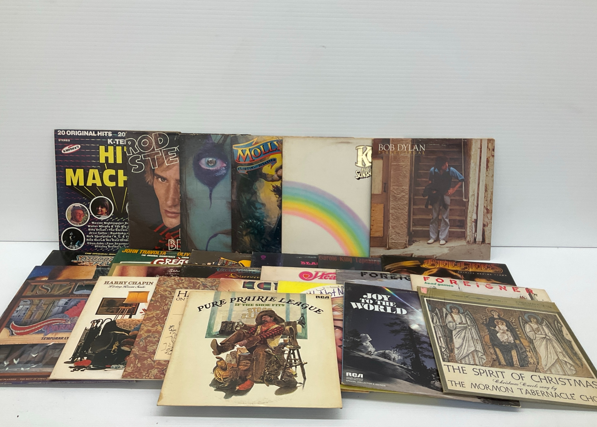 This is a collection of vinyl records featuring a diverse range of artists and genres. The collection includes records by Bob Dylan, K-Tel, Harry Chapin, Foreigner, John Travolta, Olivia Newton-John, Pure Prairie League and more.