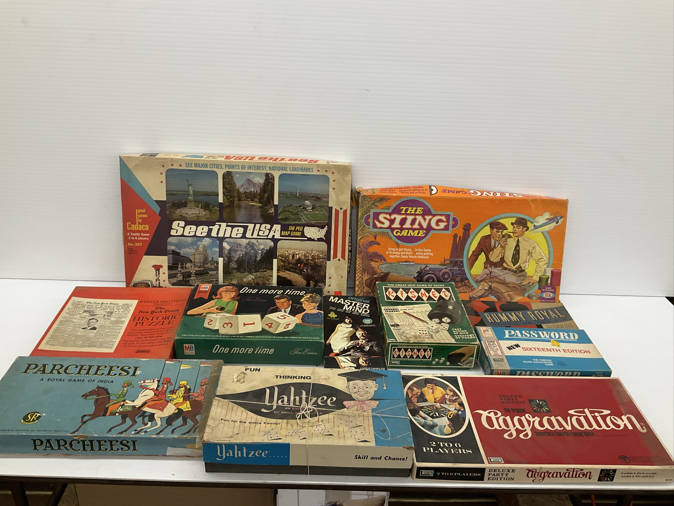A collection of various board games including See the USA, Yahtzee, Aggravation, Parcheesi, Password, The Sting, Rummy Royal, Master Mind, New York Times Historic Puzzle, and One More Time. May be missing pieces.