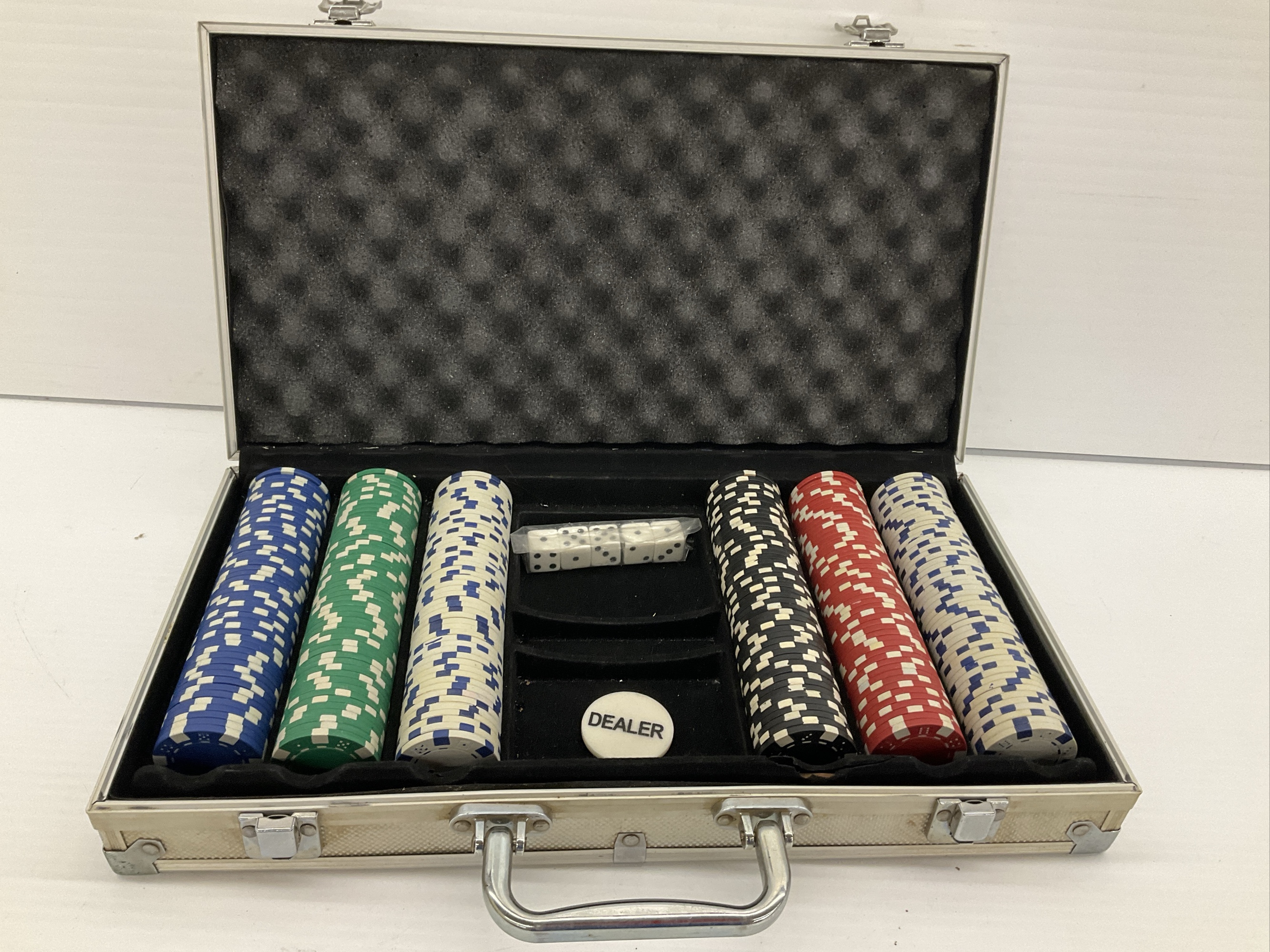 Poker chip set in a metal carrying case. The case has a latching closure and a handle for easy carrying. Inside are multiple stacks of poker chips in various colors, two dice and a dealer button. 8.5 x 15 x 3 in.