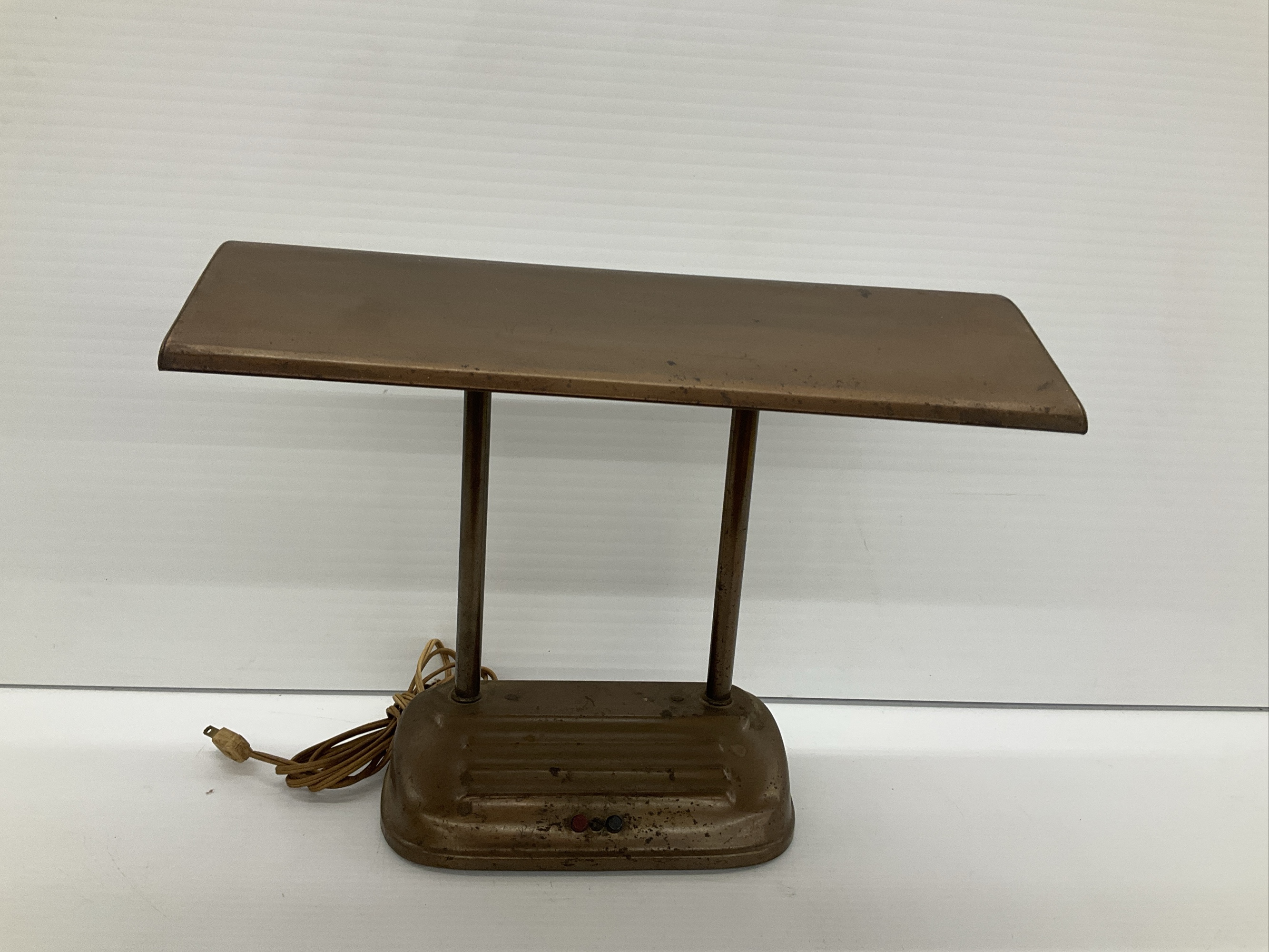 A bronze-finished desk lamp with a rectangular base and shade. The lamp has a cord with a two-prong plug and red and black switches on the base. The shade is adjustable, allowing for focused lighting. Did not light up, may need new bulb. 13 x 16 x 7 in.