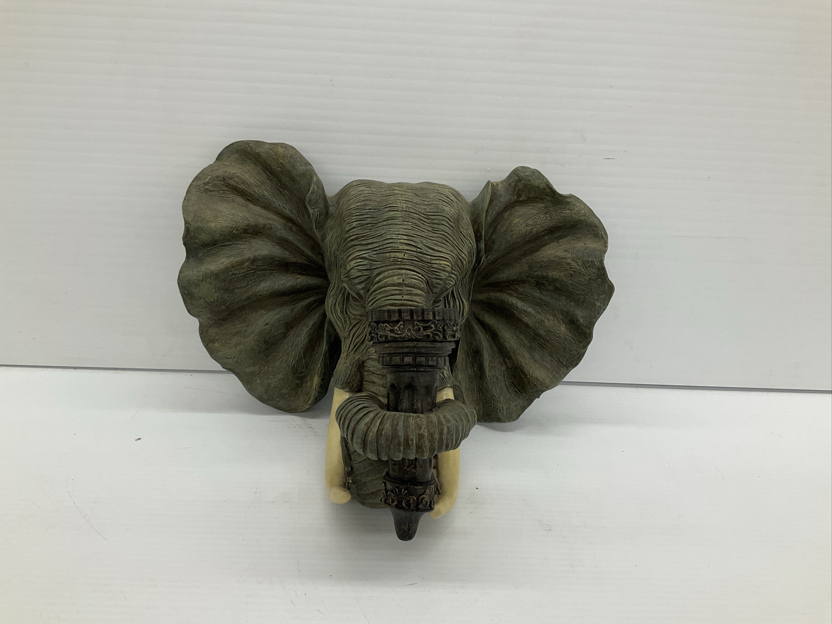 Resin elephant head statue wall mount. Features the elephant holding a candle holder. 10 x 14 x 8 in.