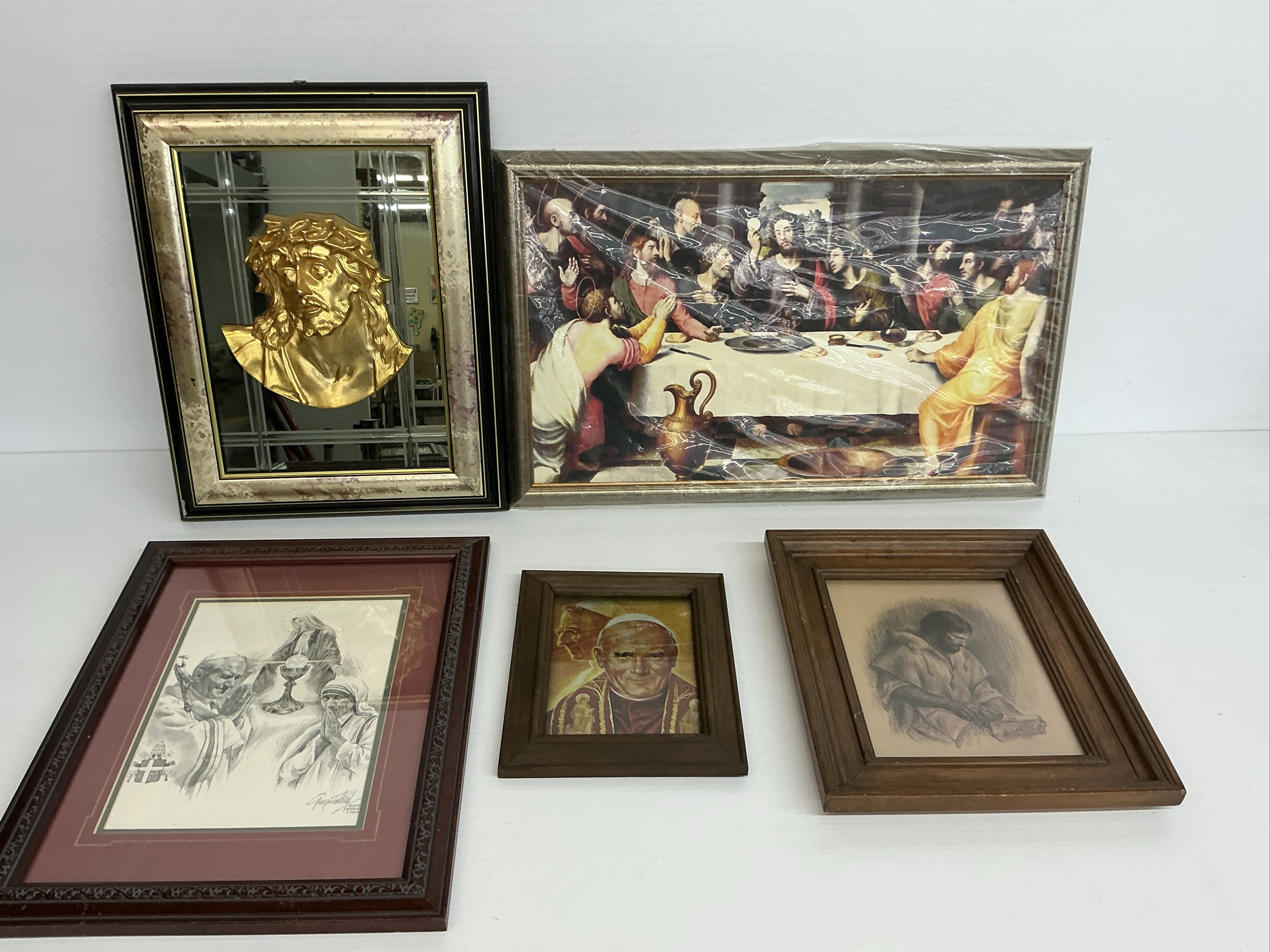 Collection of five framed art pieces with religious themes, including depiction of the Last Supper, Mother Teresa, and portraits of Popes. Various sizes and frame styles. Largest 16 x 25 in.