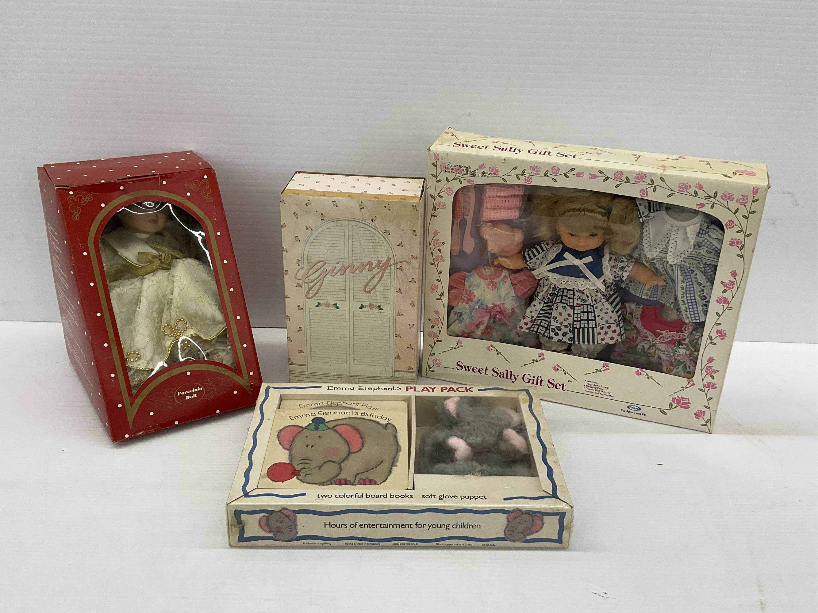 This lot features an assortment of dolls and accessories. Included is a Ginny doll from Dakin, a Sweet Sally Gift Set doll with additional outfits and accessories, and an Emma Elephant's Play Pack with two board books and a soft glove puppet. Largest 13 x 15 in.