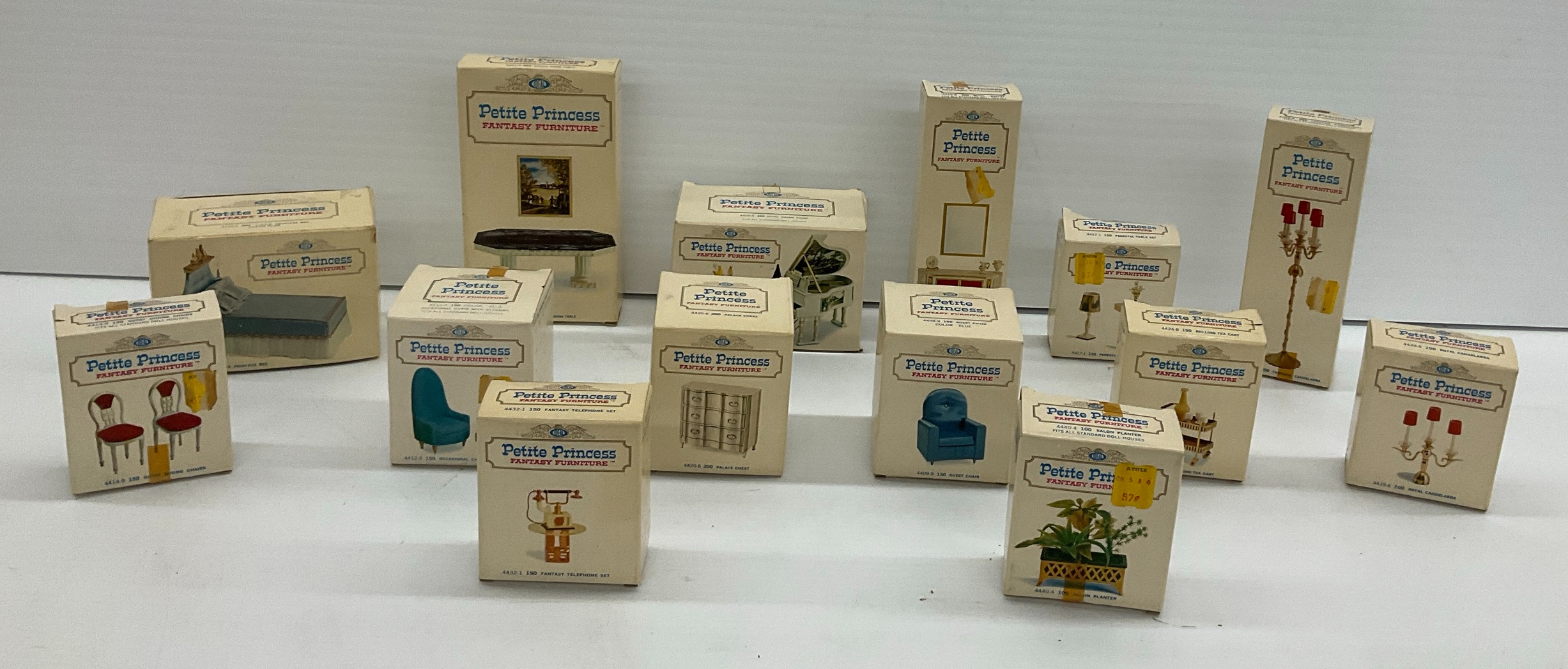 This auction features a collection of 14 boxed sets of Petite Princess Fantasy Furniture. Each set includes miniature furniture pieces, complete with their original packaging. This collection offers a glimpse into miniature decor from a bygone era.