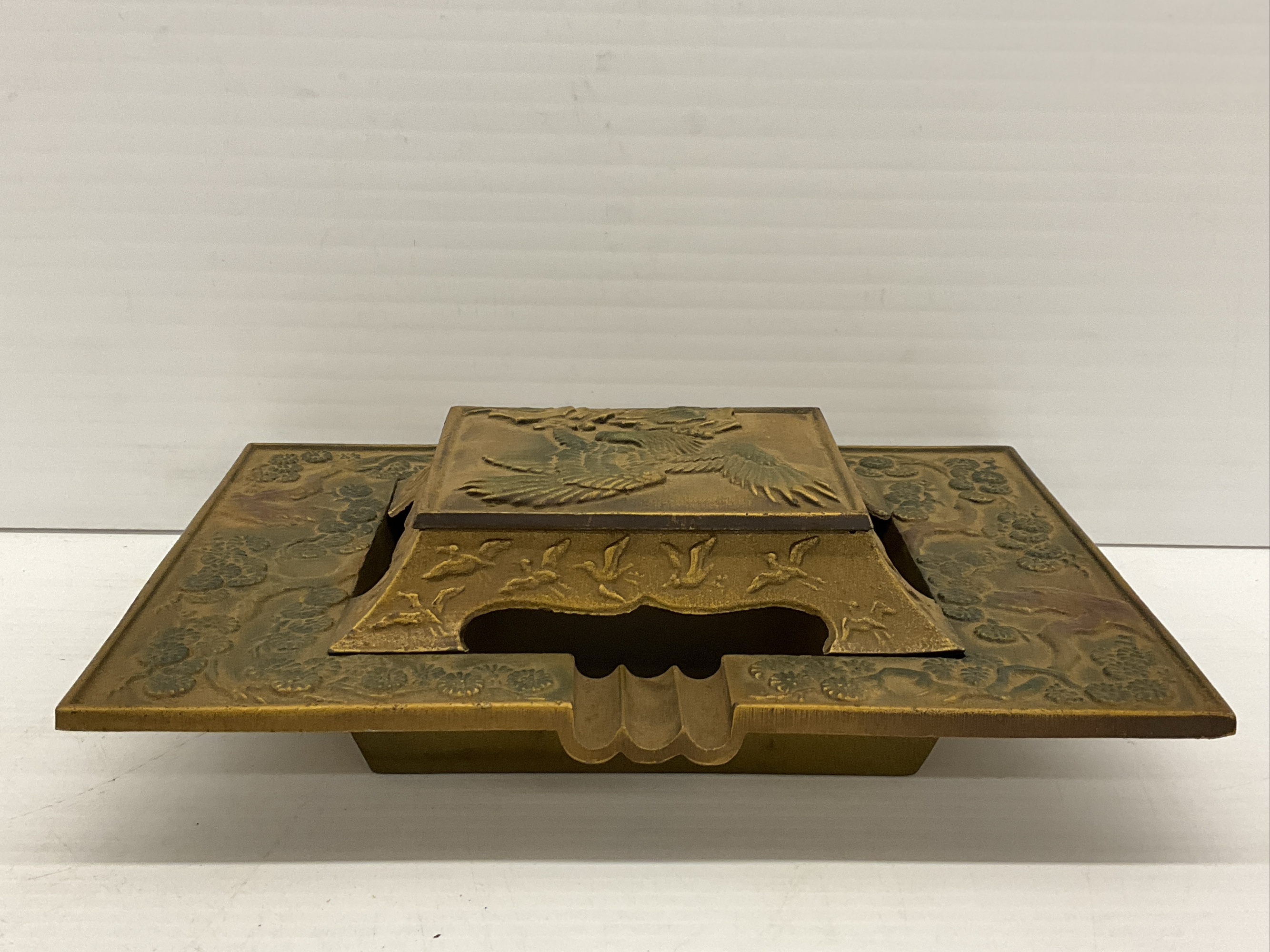 This decorative metal ashtray features a square base with floral details and a removable lid with an eagle design. It includes a separate stand to elevate the lid when in use. 3.5 x 11 x 8 in.