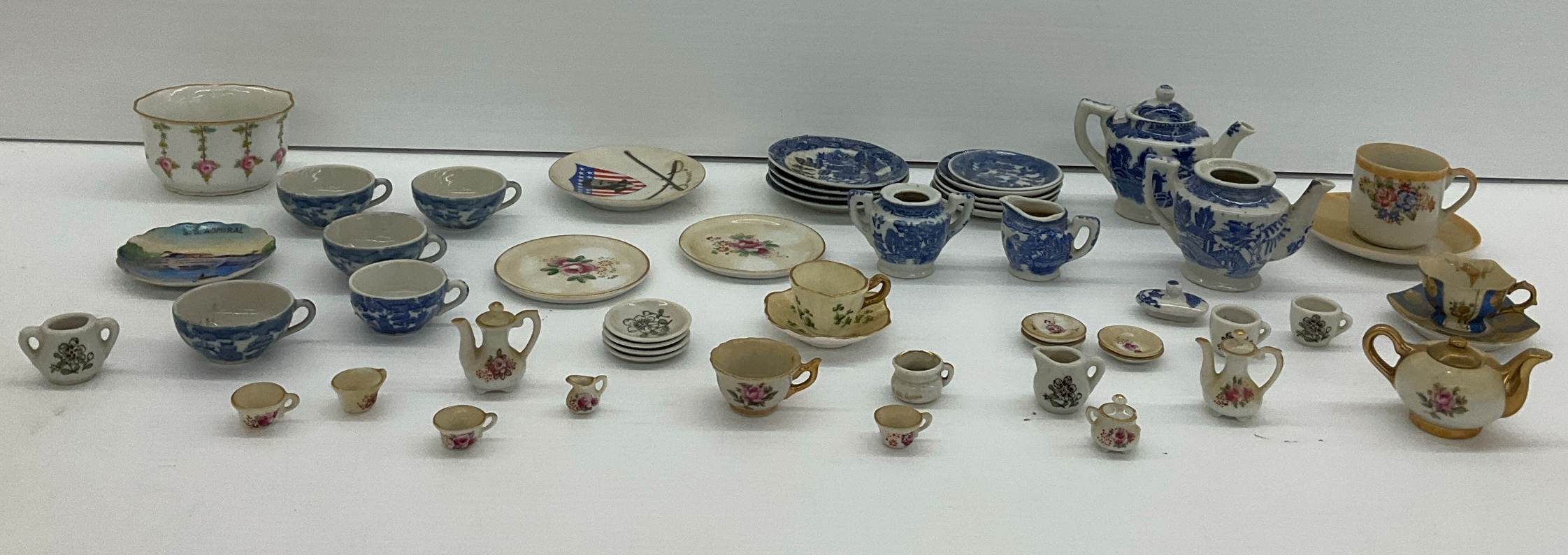 A mixed collection of miniature china tea sets and individual pieces. Includes teapots, cups, saucers, and other small serving pieces. Some pieces are marked 'Made in Occupied Japan', 'Sandford Made in England', and 'Saxe'. Tallest measures 4 in.