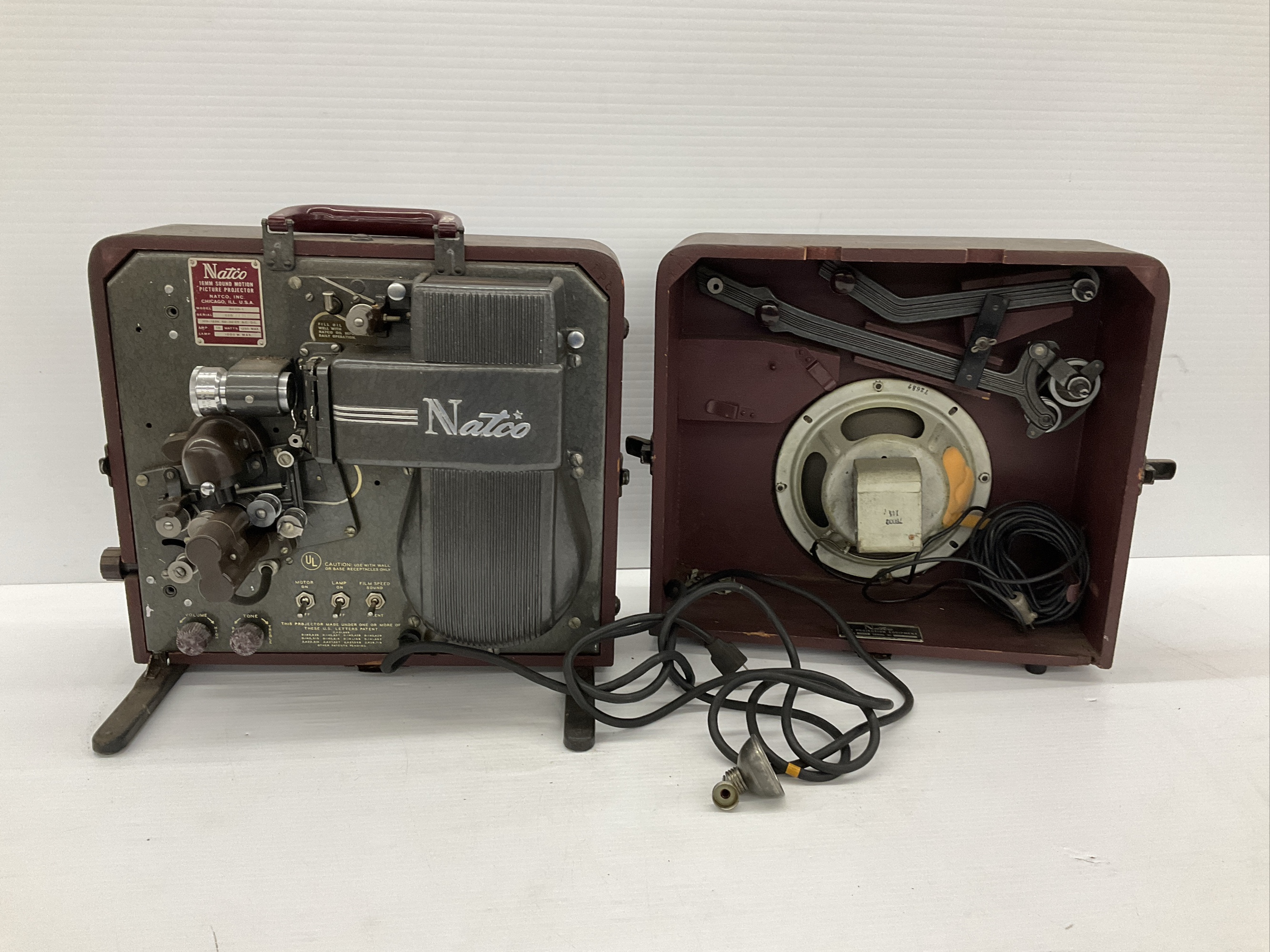 Natco 16mm Sound Motion Picture Projector Model 3030-1 and Natco Film Projection Equipment Model 3035. Includes a speaker. Lamp and motor work. 17 x 16 x 11 in.