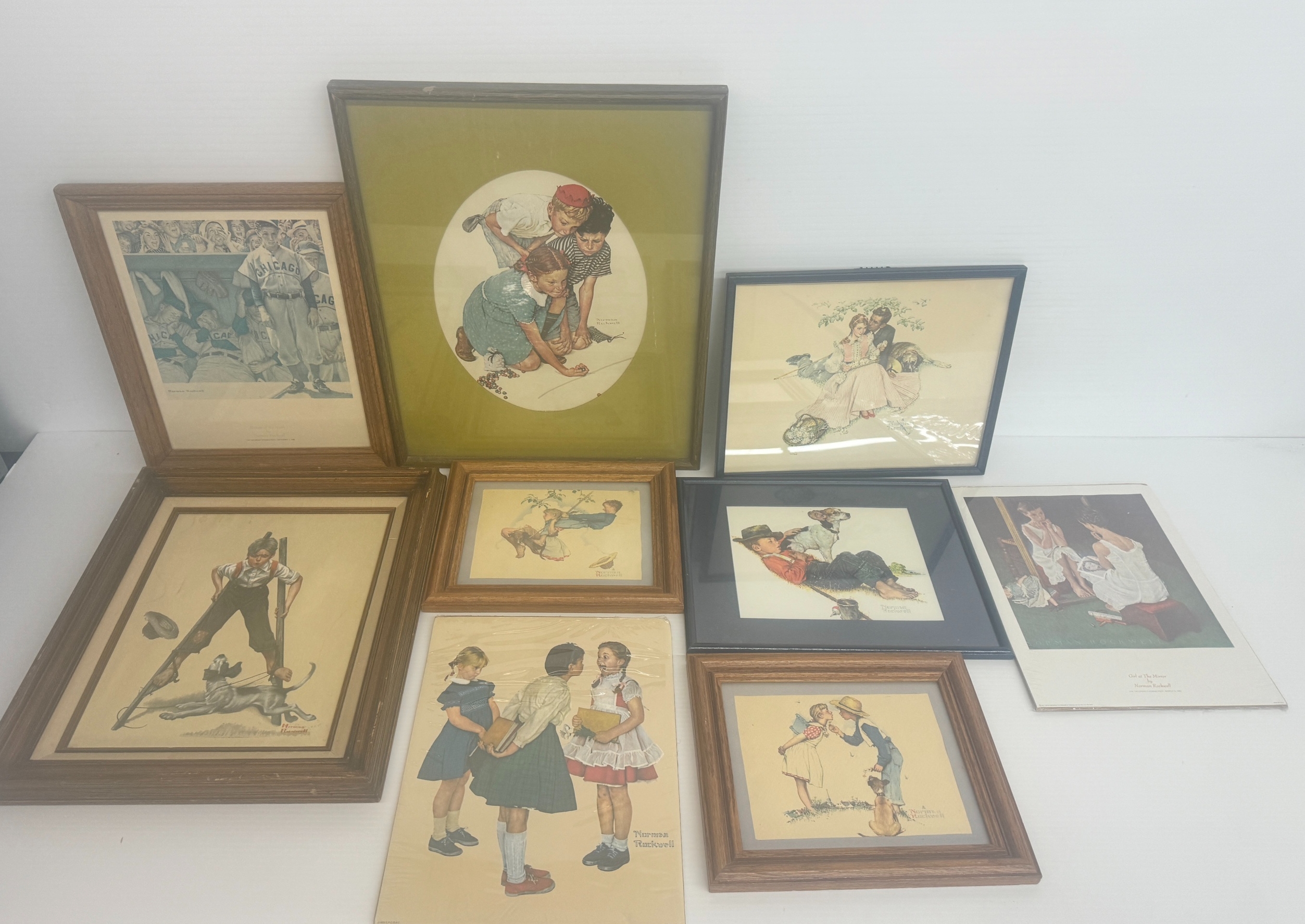 A collection of various framed and unframed prints by Norman Rockwell. The prints depict different scenes with children, baseball players, and families. Largest 16 x 20 in.