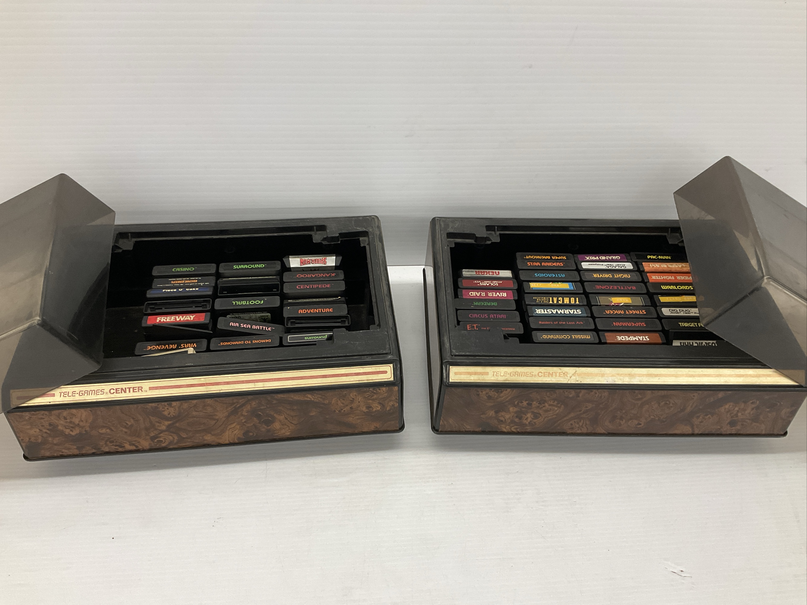 Two Tele-Games Center cartridge storage cases, each filled with Atari game cartridges. Titles include Pac-Man, Space Invaders, E.T., Frogger, Mario Bros., Donkey Kong, and more.
