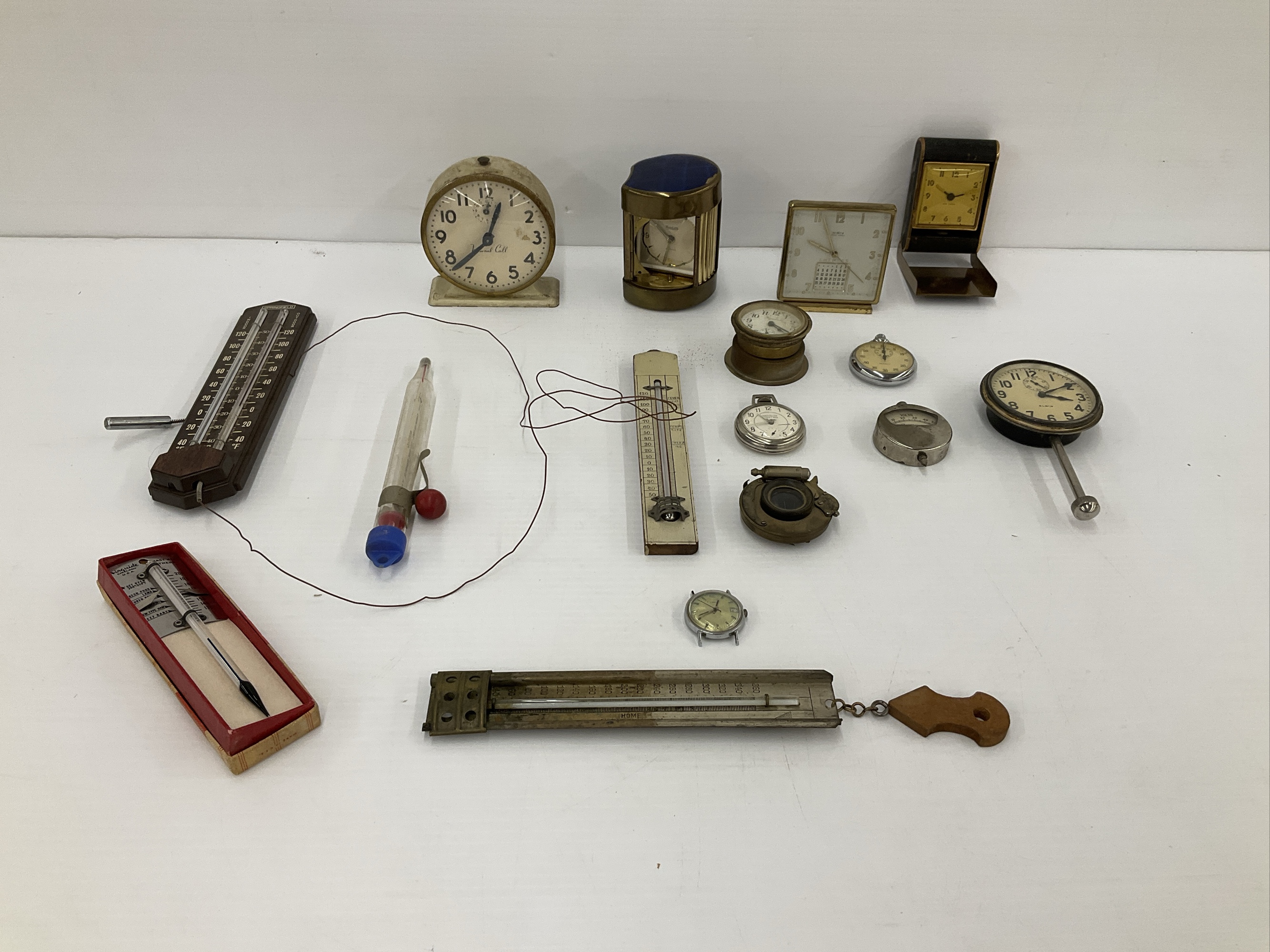 This lot includes a diverse collection of clocks, watches, thermometers and other items. There are various types of clocks, including desk clocks, pocket watches, and travel clocks. The thermometers include both industrial and home varieties, one marked 'candy thermometer'. We do not guarantee clocks or watches to run.